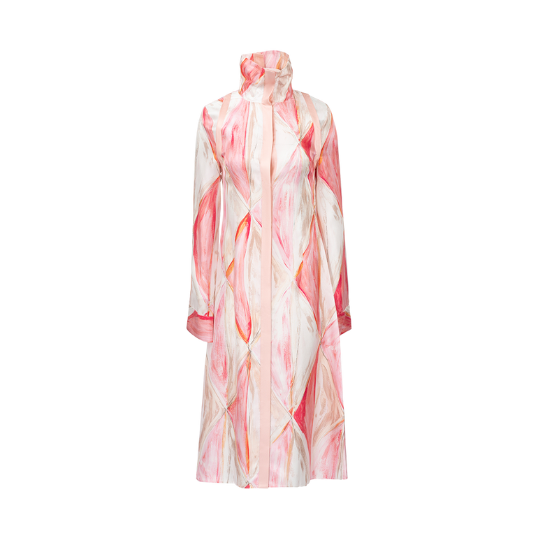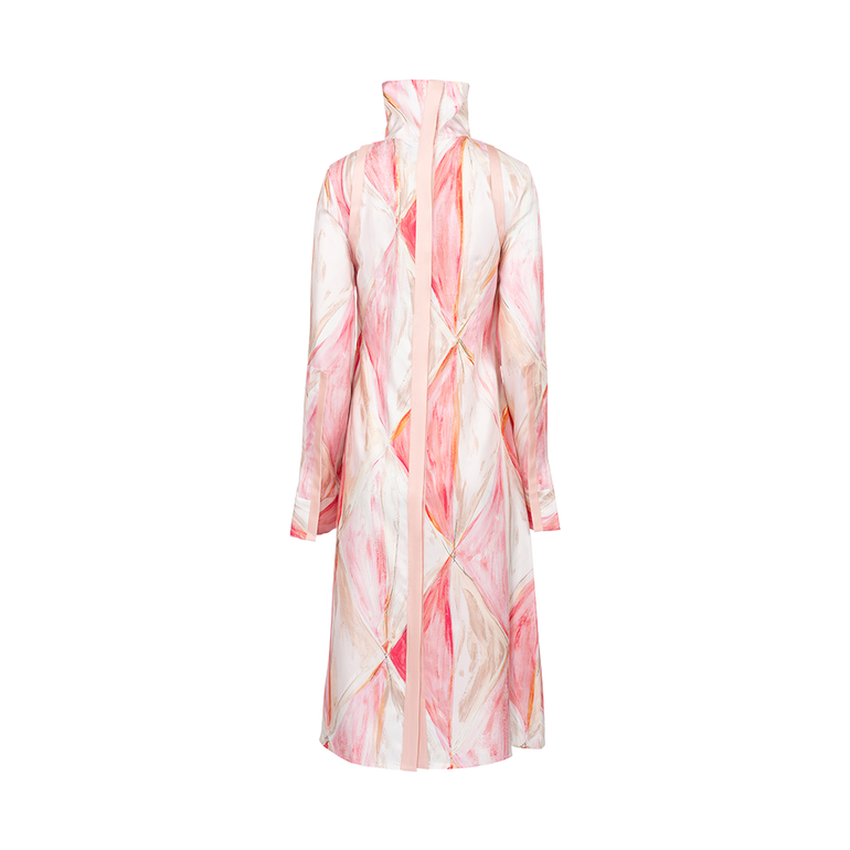 Shirtdress in allover graphic print with high neckline, long sleeves and concealed front placket.