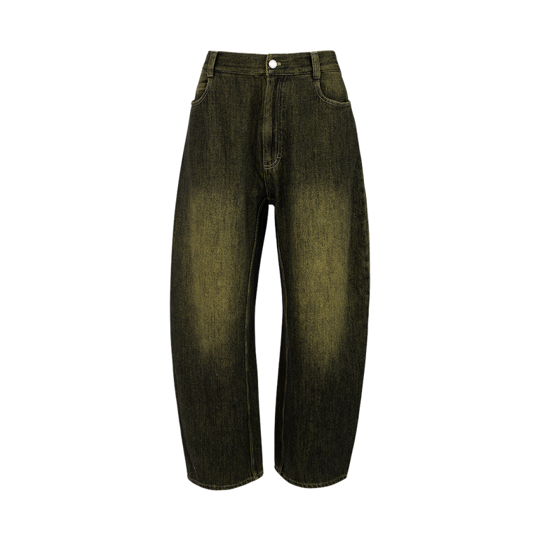 Cropped denim pants with partial elasticated waistband and oversized back pockets.