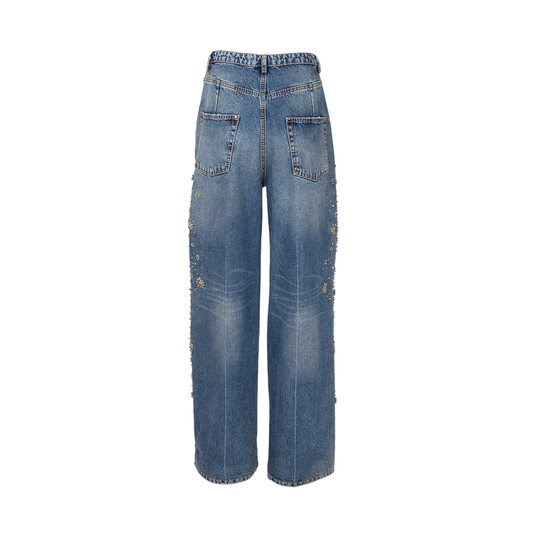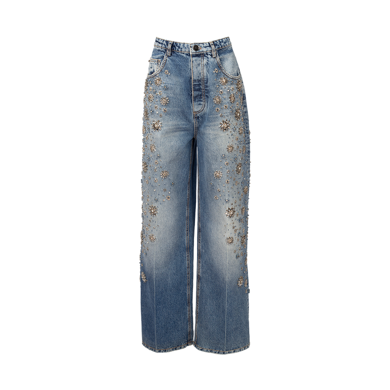 Wide-leg pants with high-waisted fit and hand-applied floral crystal embellishments.