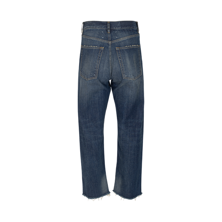 Straight-leg jeans in five-pocket styling with grayed hems.