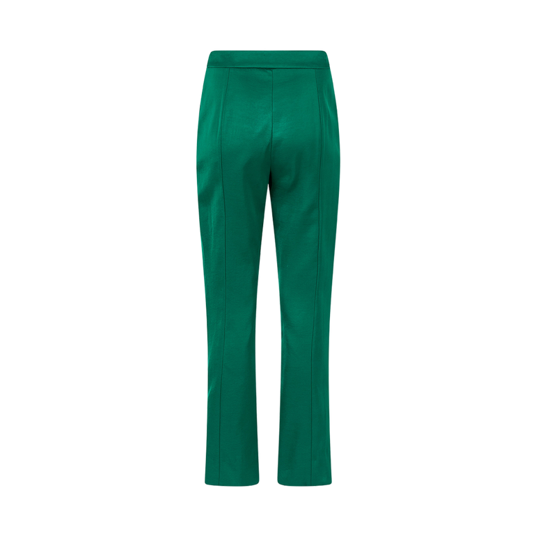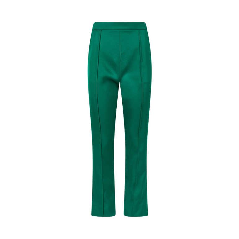 Tailored pant in double-faced satin with structured fit throughout the waist and hip. Lined.