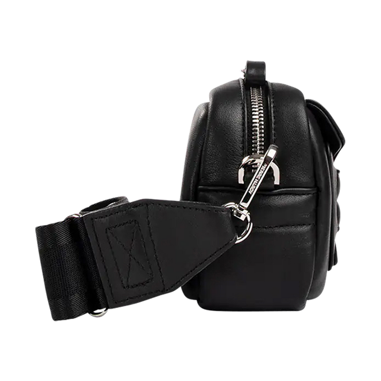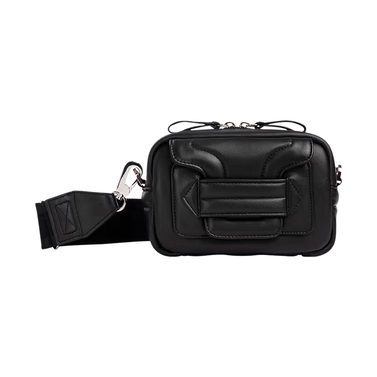Bag with zip closure, slot pocket and hidden magnetic-snap closure, adjustable/removable strap, back pocket and small round mirror inside. Approx. 7.1"L x 2"W x 4.7"H.