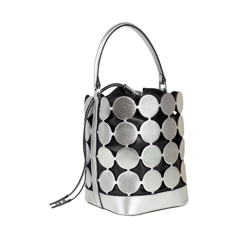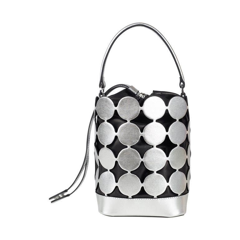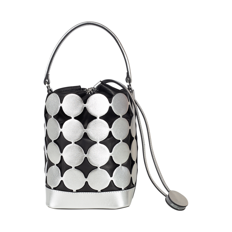 Bucket bag in circle design with top handle, removable shoulder strap and drawstring closure. Approx. 13"H x 20"W x 13"D