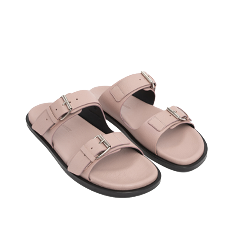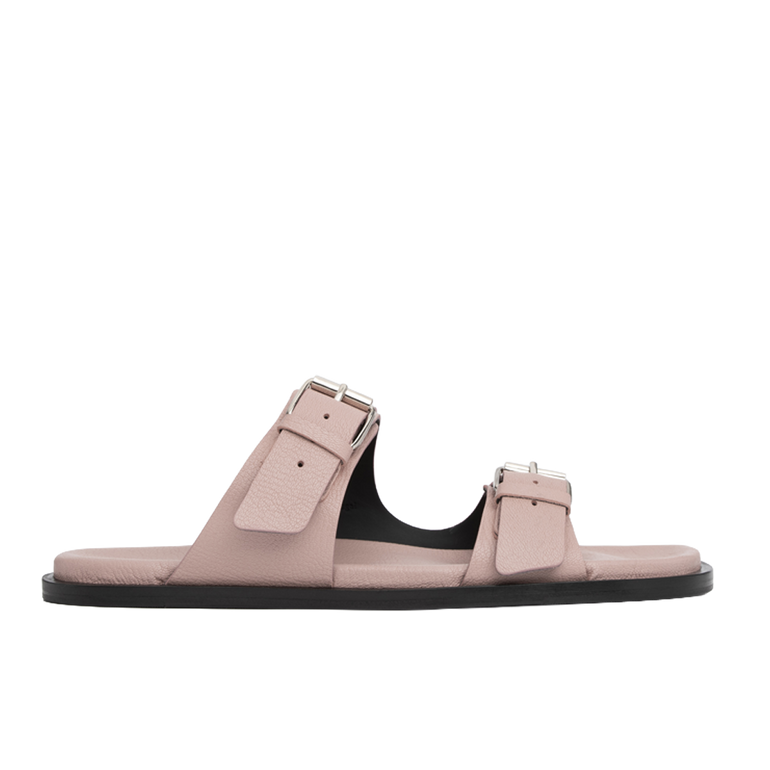 Mule sandal with adjustable silver-tone metal buckles and 10MM heel.