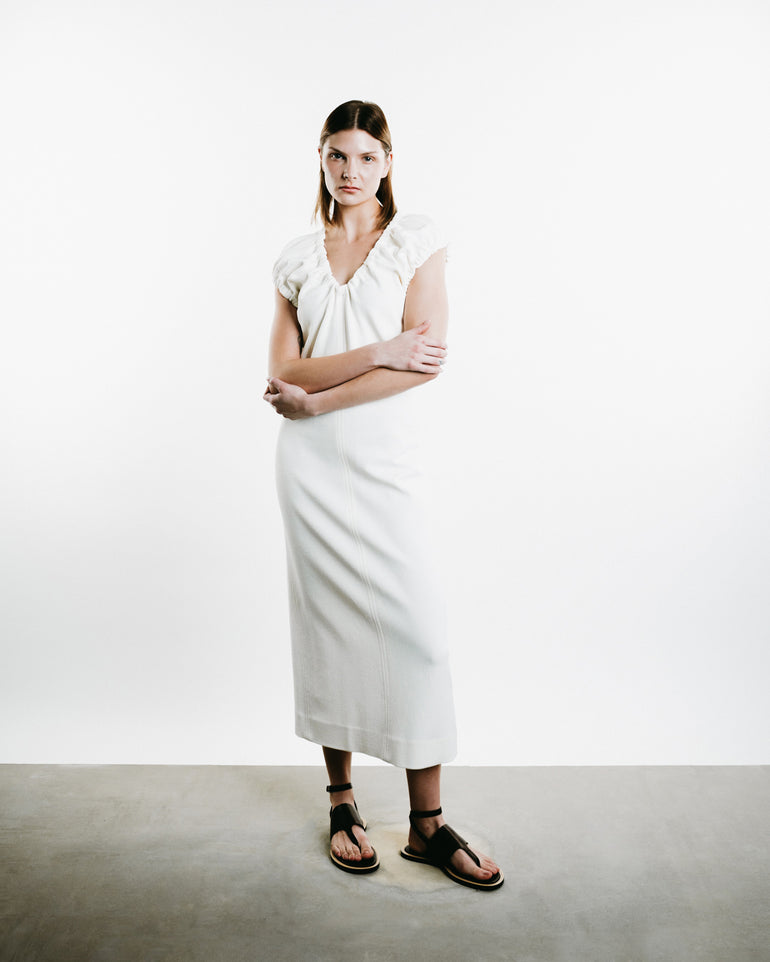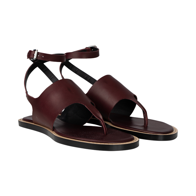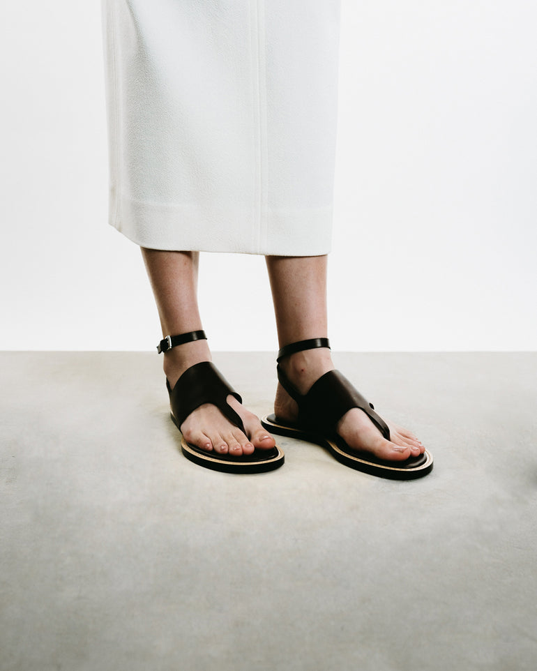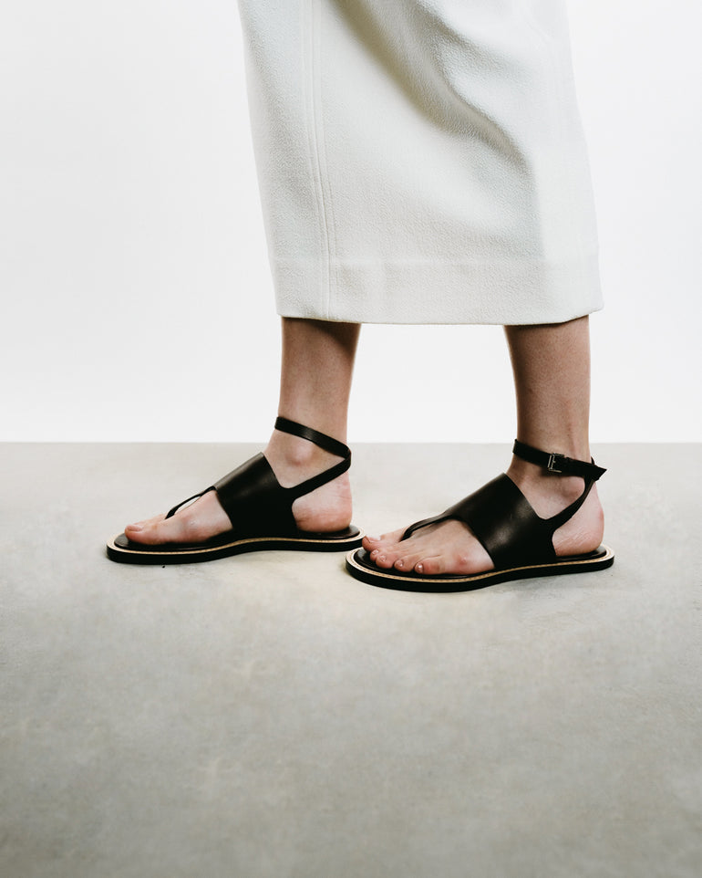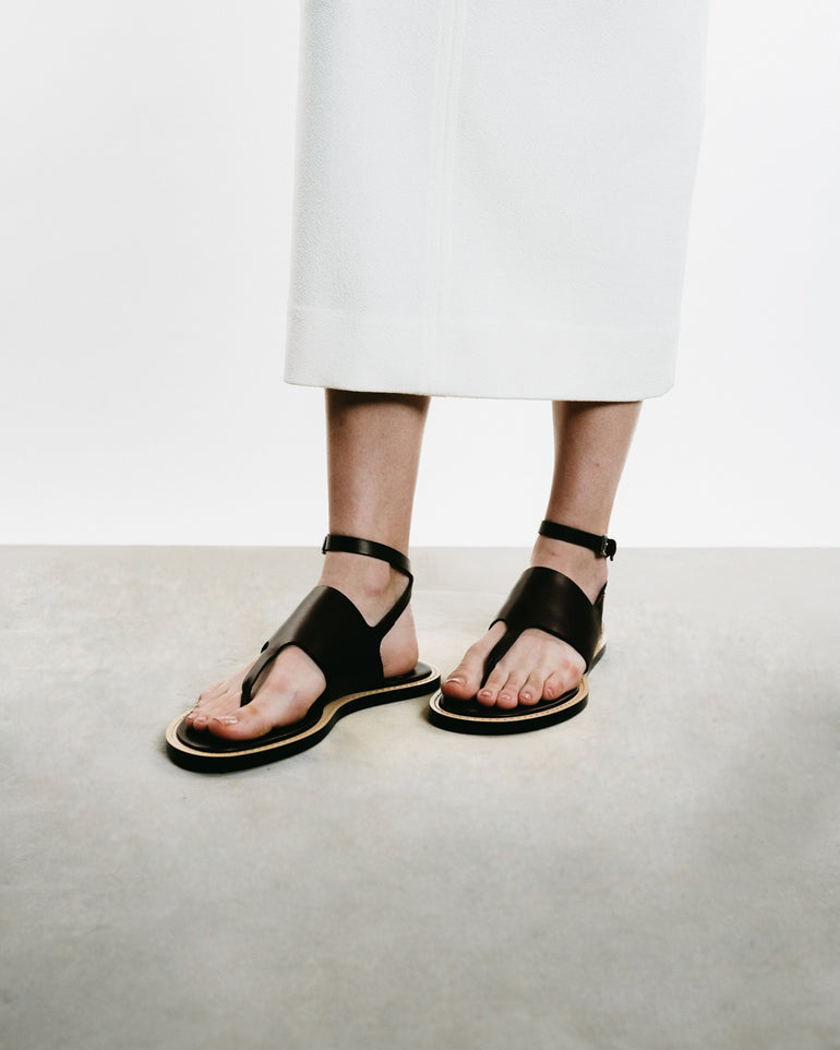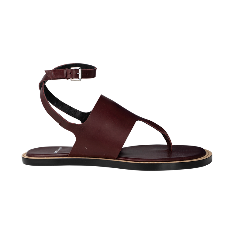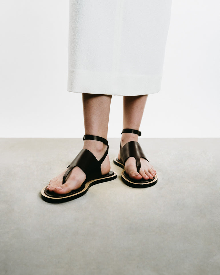 Sandal with thong strap, adjustable ankle strap and 0.25" flat heel.
