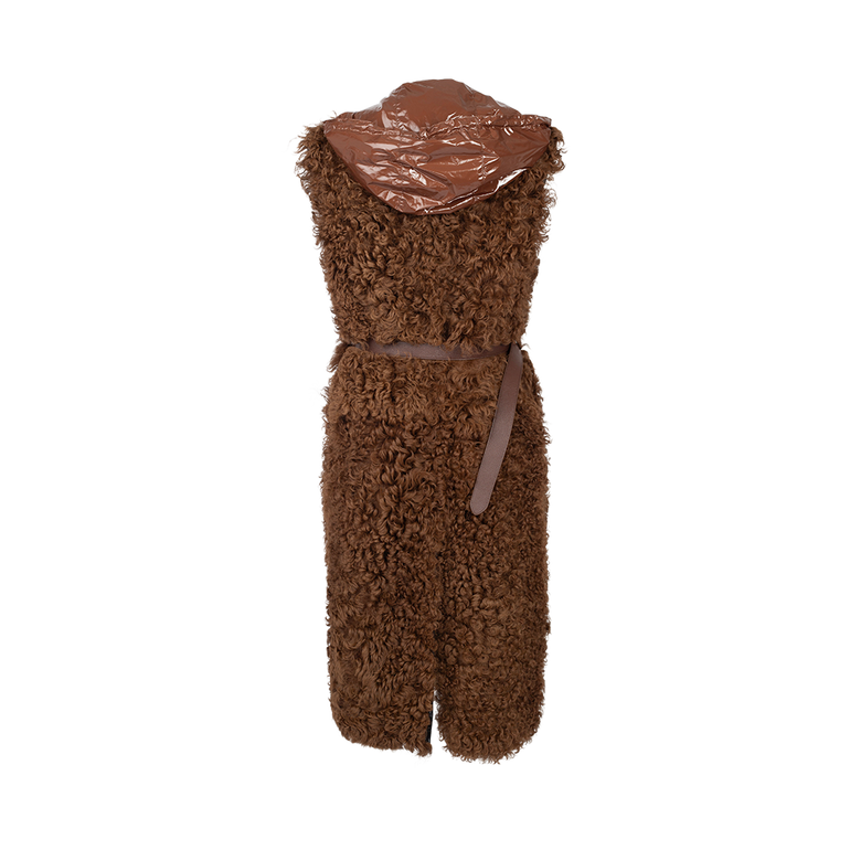 Long vest in shearling construction with open front, belted waist and hood.