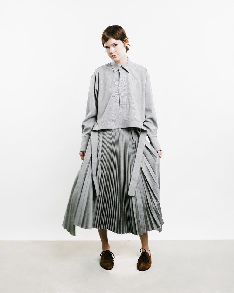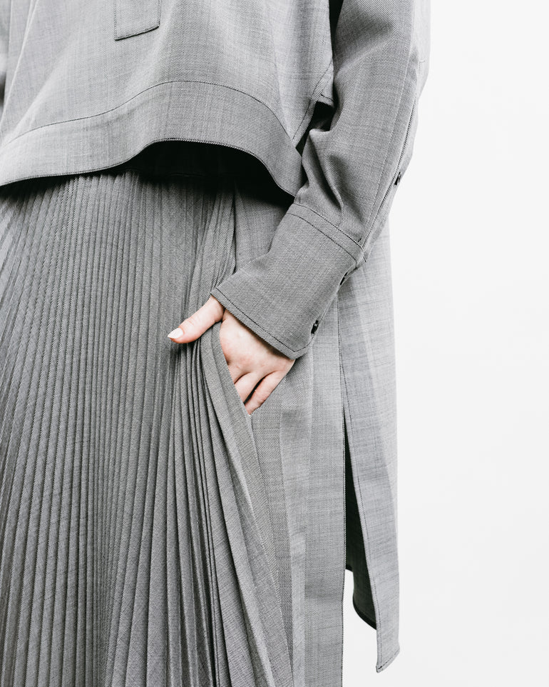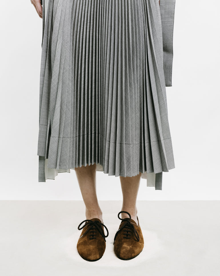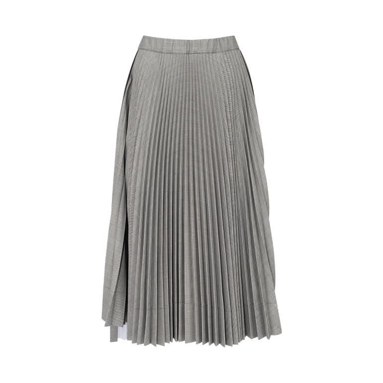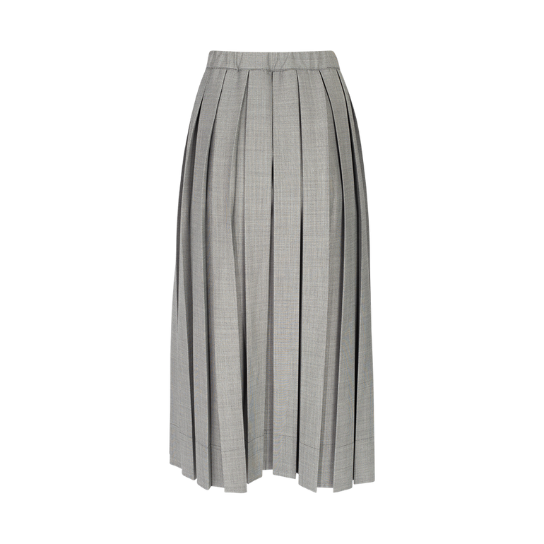 Pleated midi skirt with high elasticated waistband, slender pleats at front, large pleats at back and asymmetric hem. Lined.