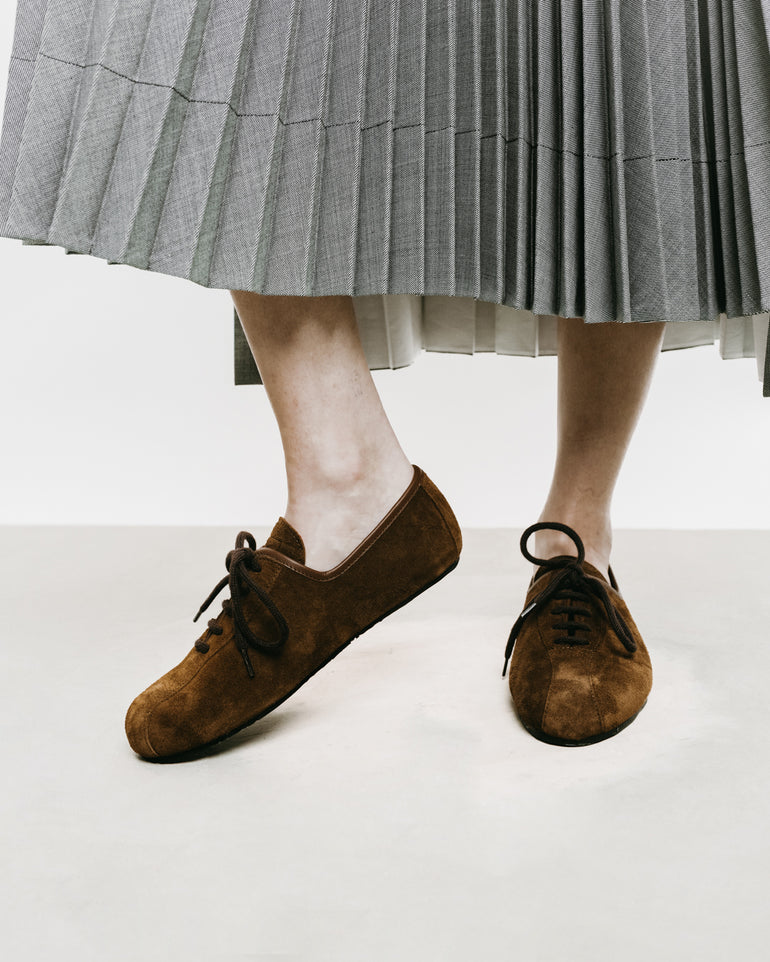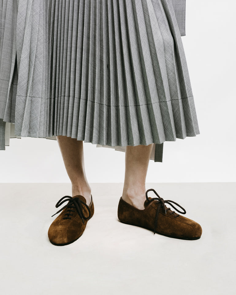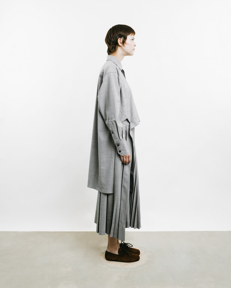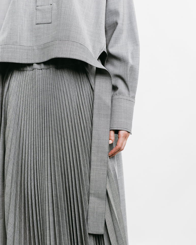Pleated midi skirt with high elasticated waistband, slender pleats at front, large pleats at back and asymmetric hem. Lined.