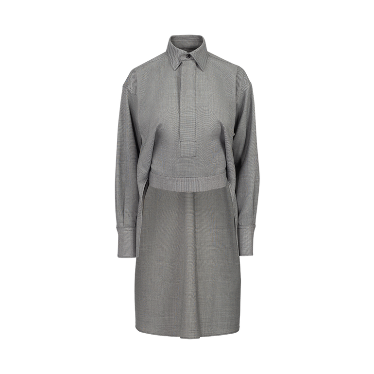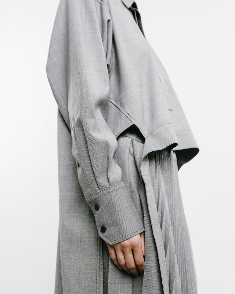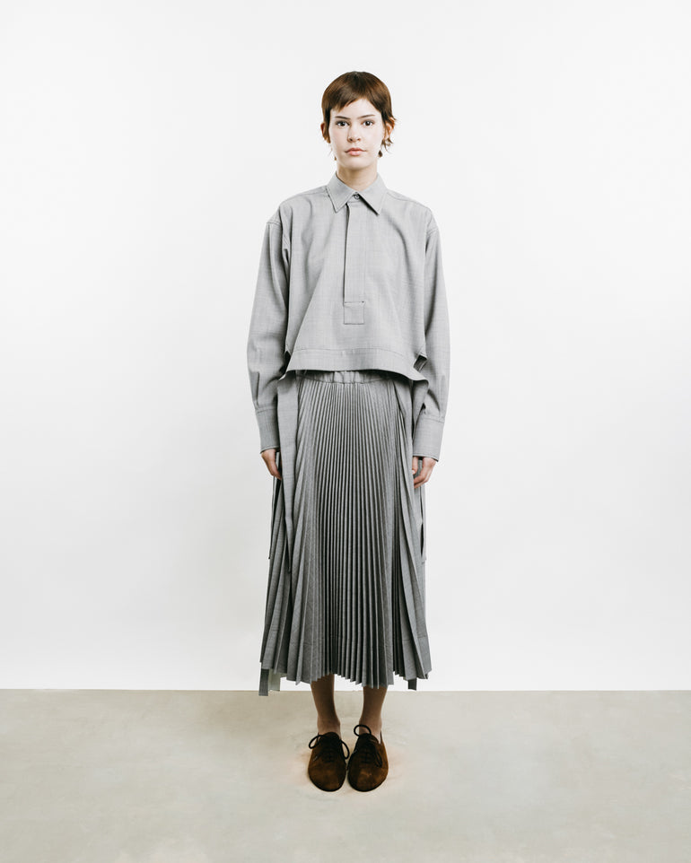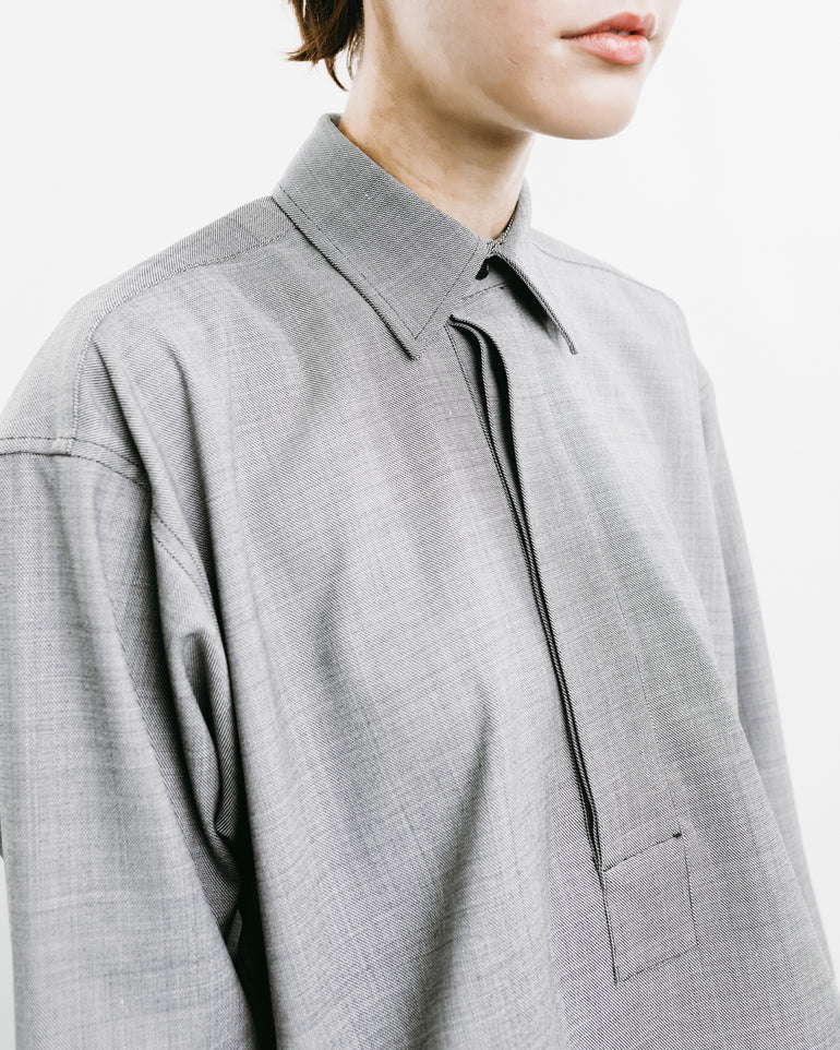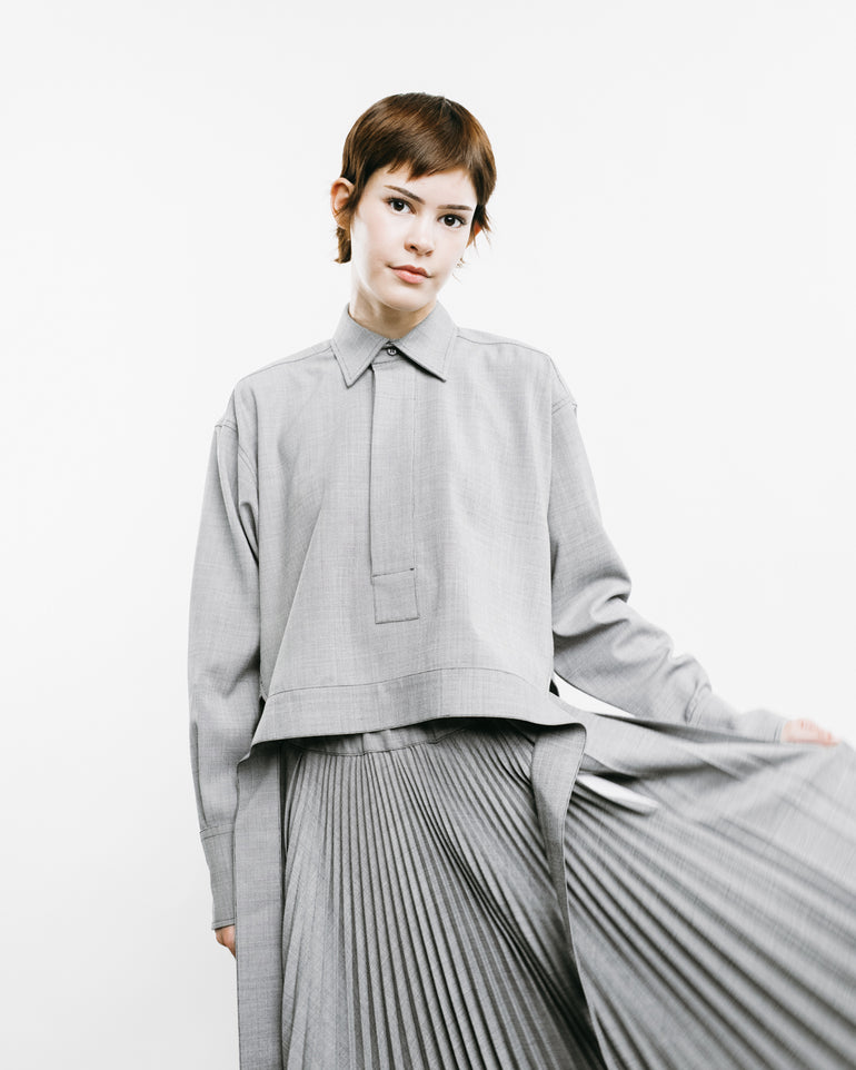 Long-sleeved shirt with cropped square top, concealed button front and tail at back.