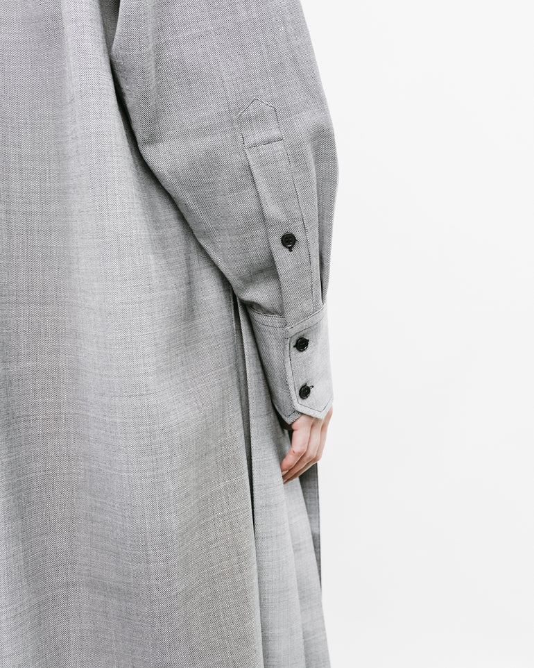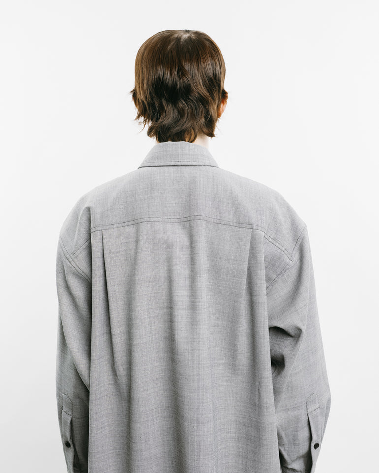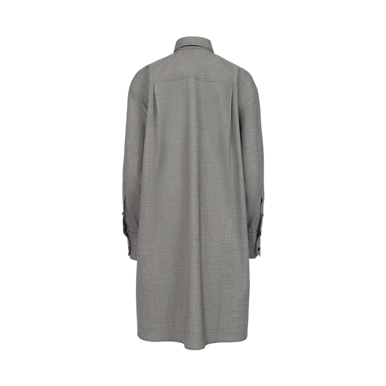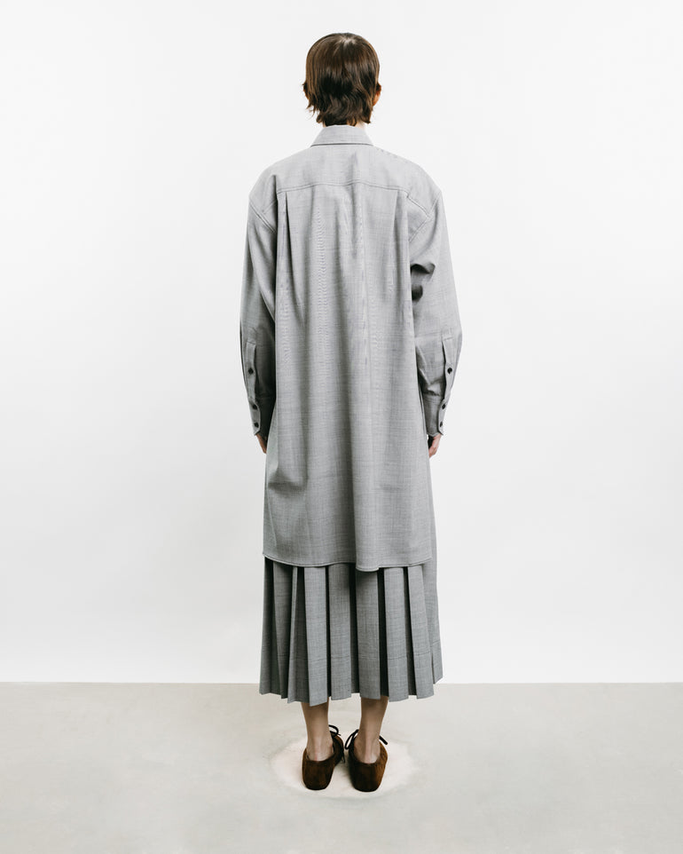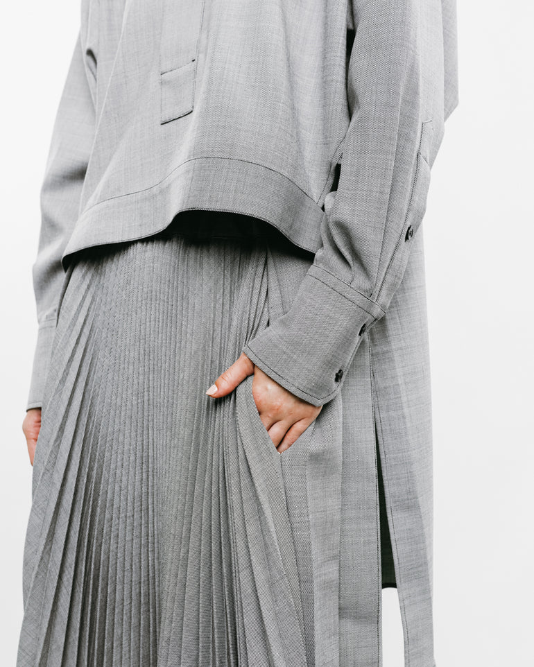 Long-sleeved shirt with cropped square top, concealed button front and tail at back.