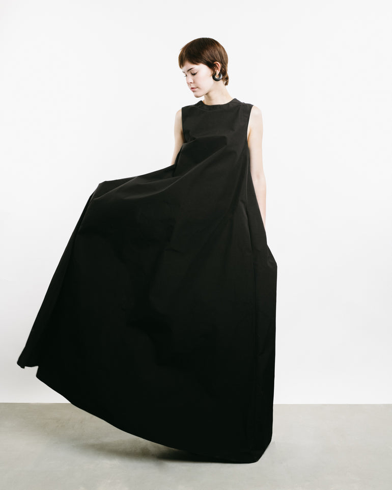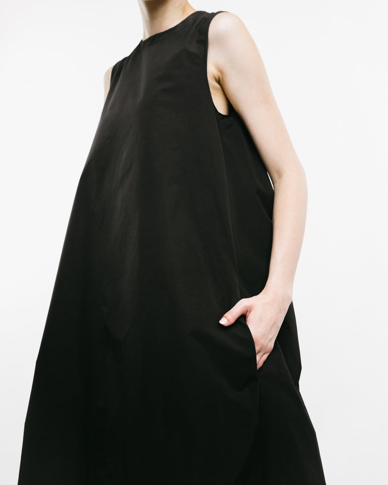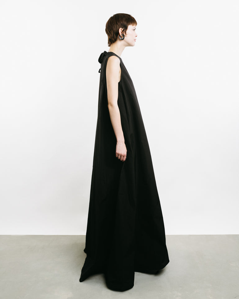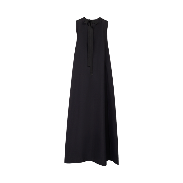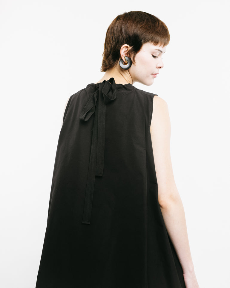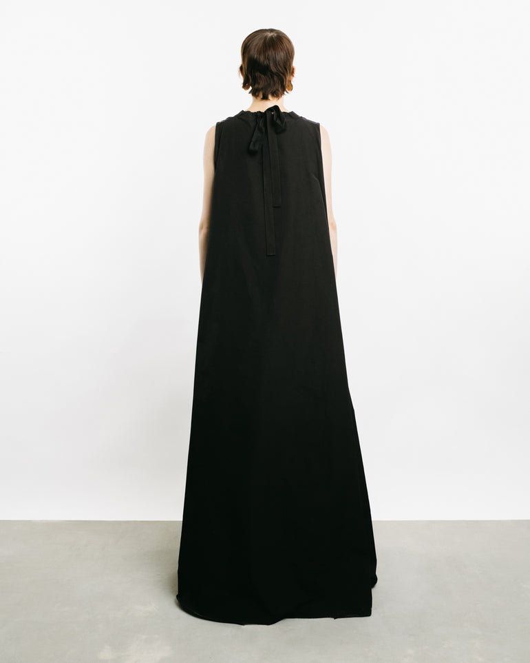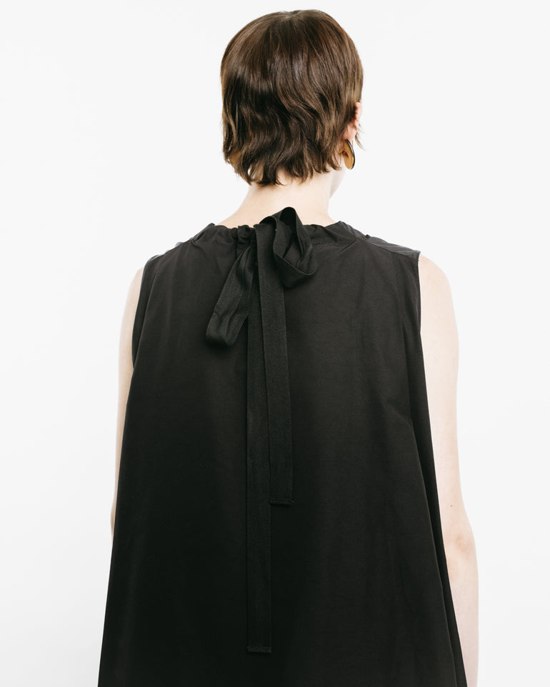 Sleeveless dress with side slit pockets and self-tie neck and back.