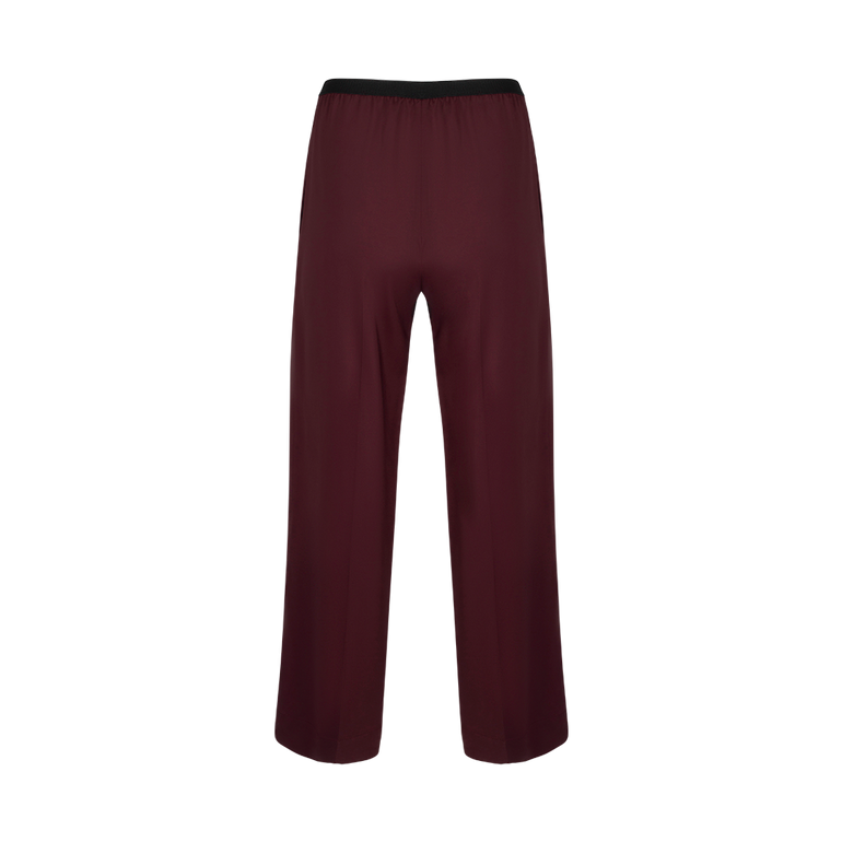 Wide trousers with black elasticated waist, front press folds and side slip pockets.