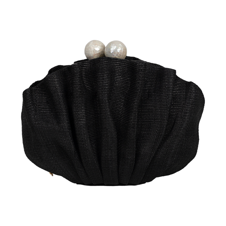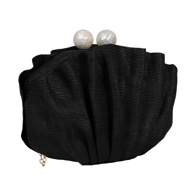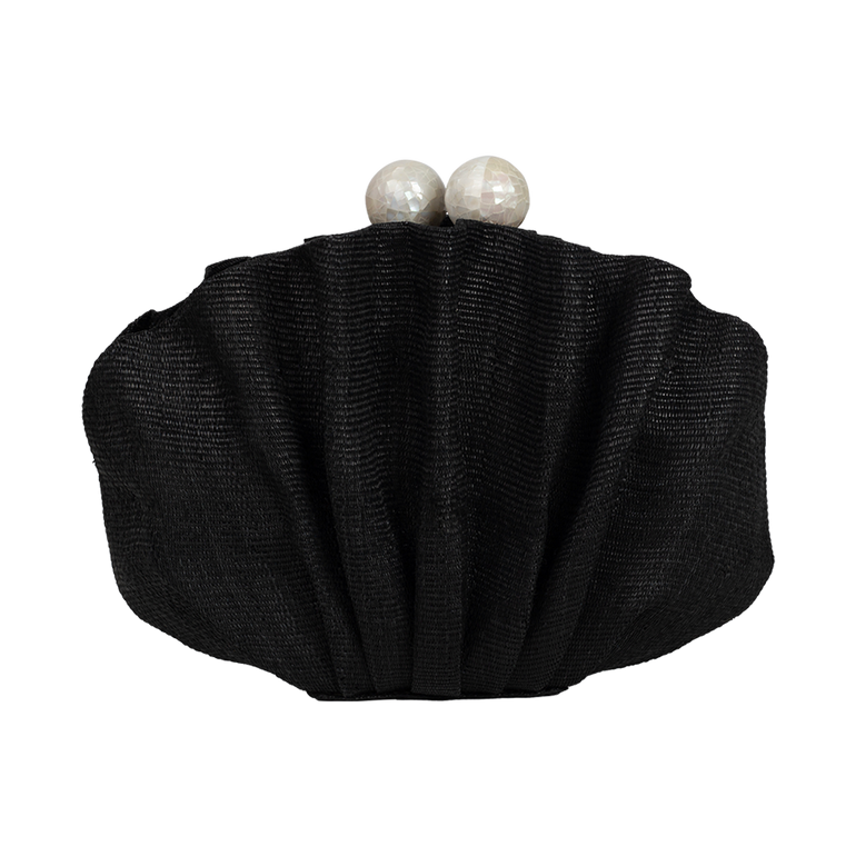 Clutch in shell shape with chain strap and magnet closure. Approx. 9"L x 7"H x 3"D.