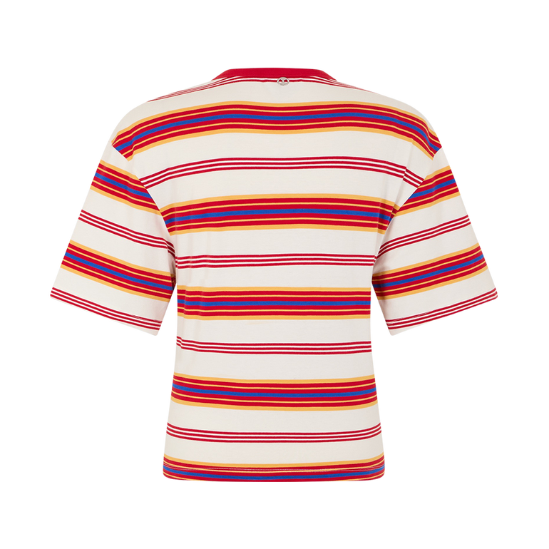 Crewneck short-sleeved tee with contrast stripe pattern. Cropped length. Silver piercing detail on the front.