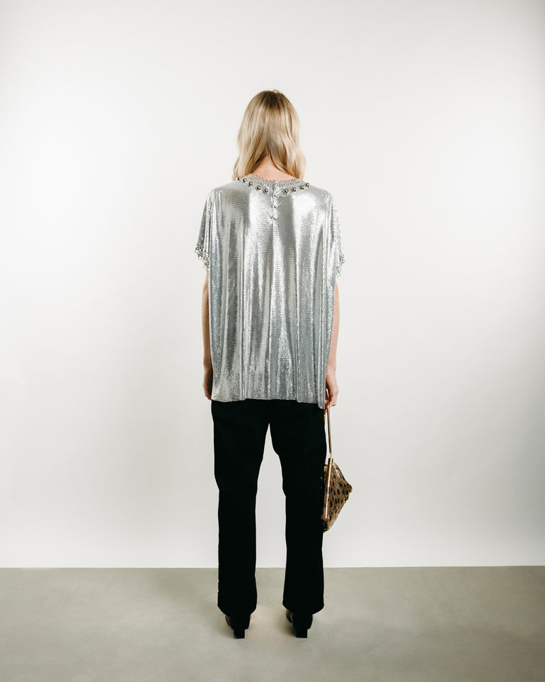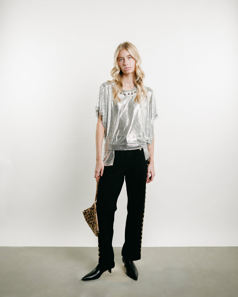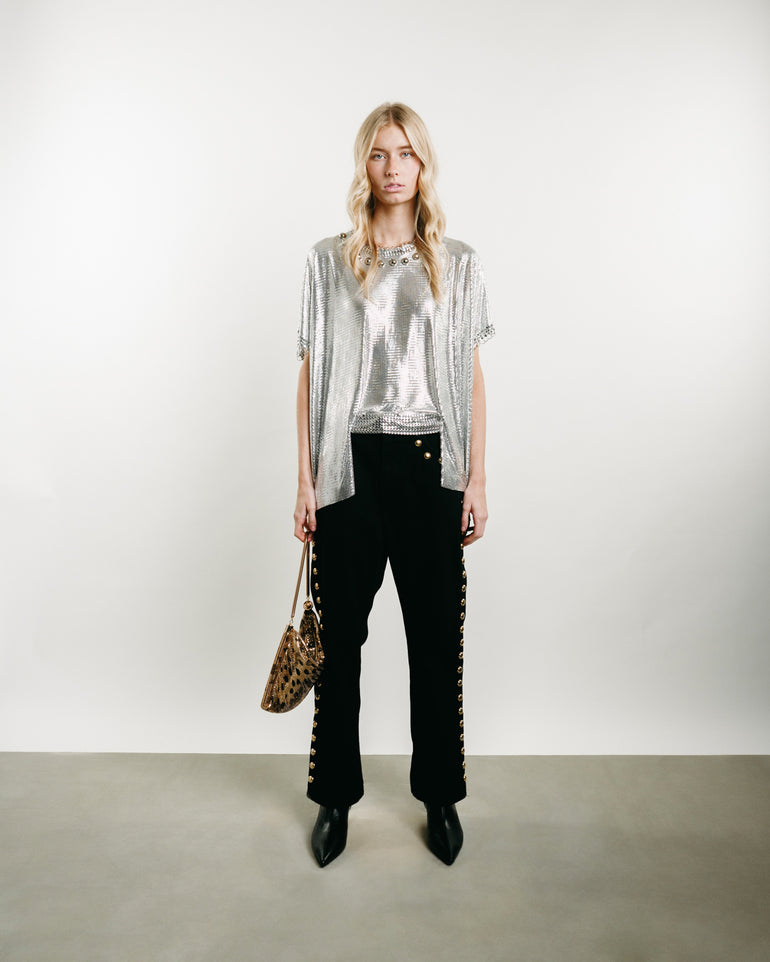Black denim low-rise, large gold studs framing the denim, ankle-length and zip and button fly.