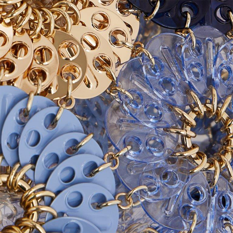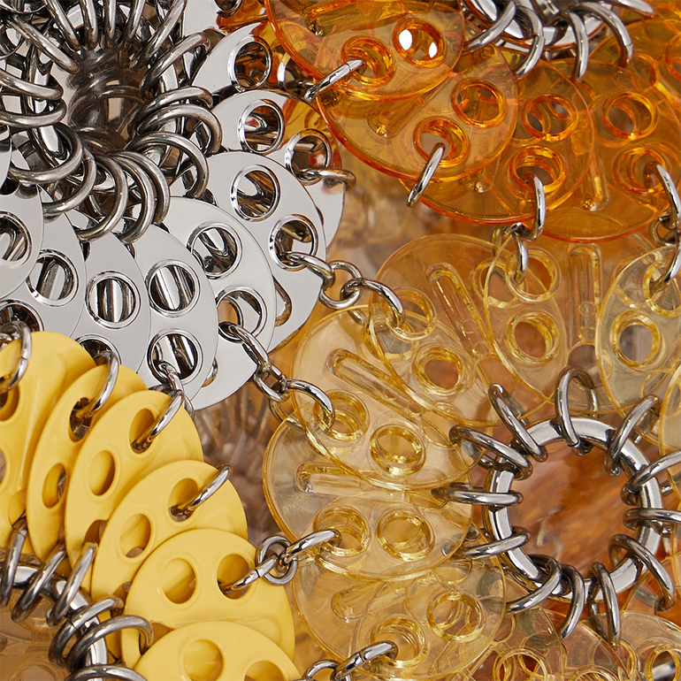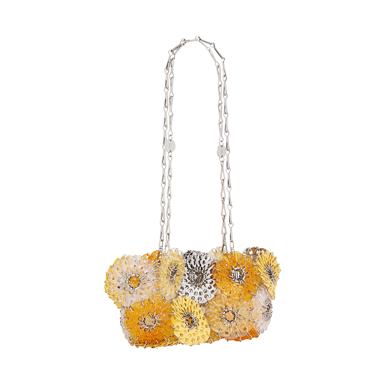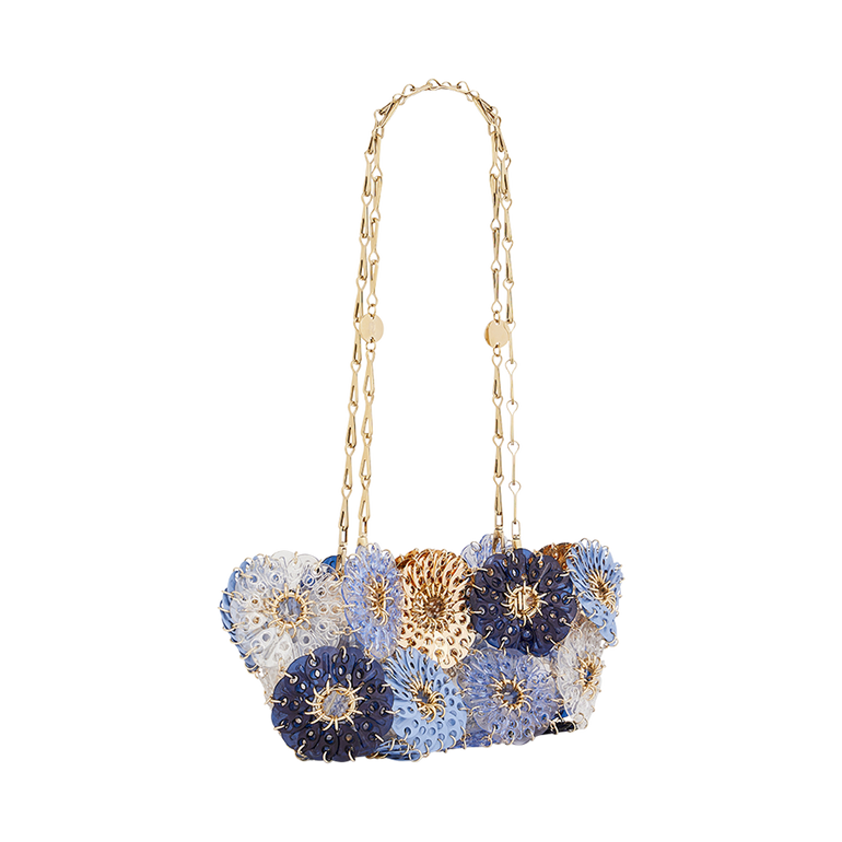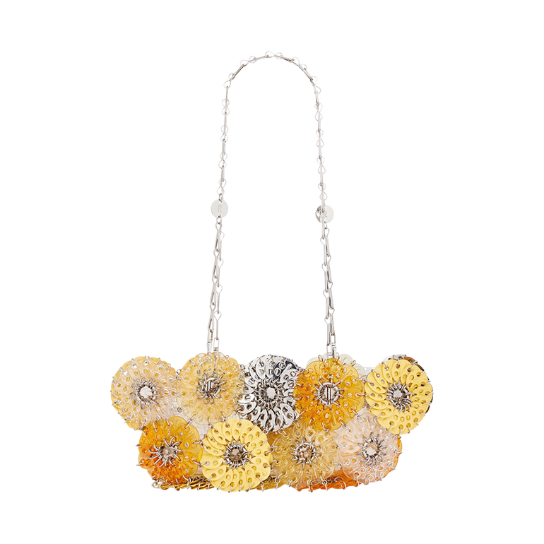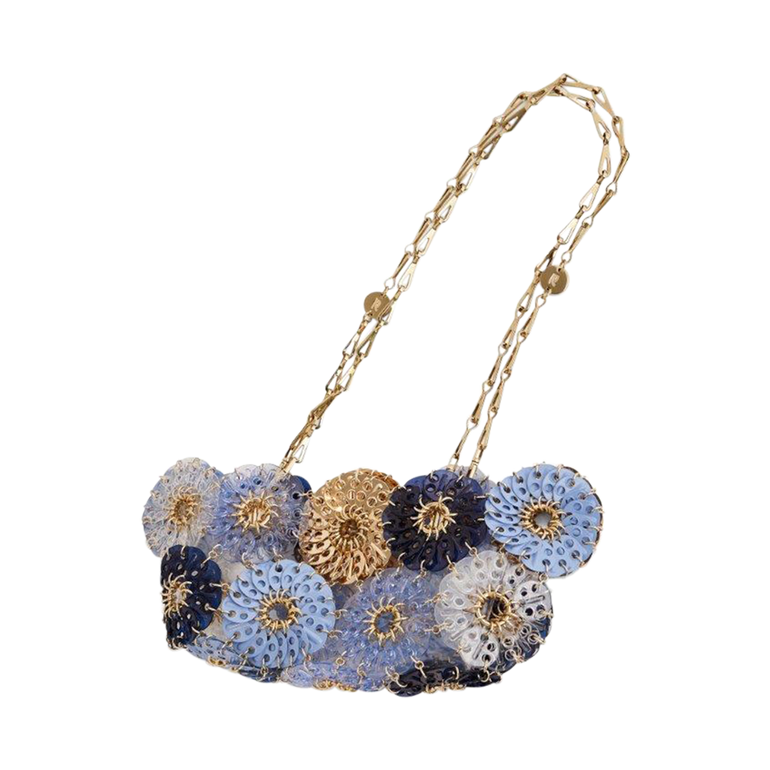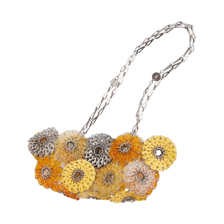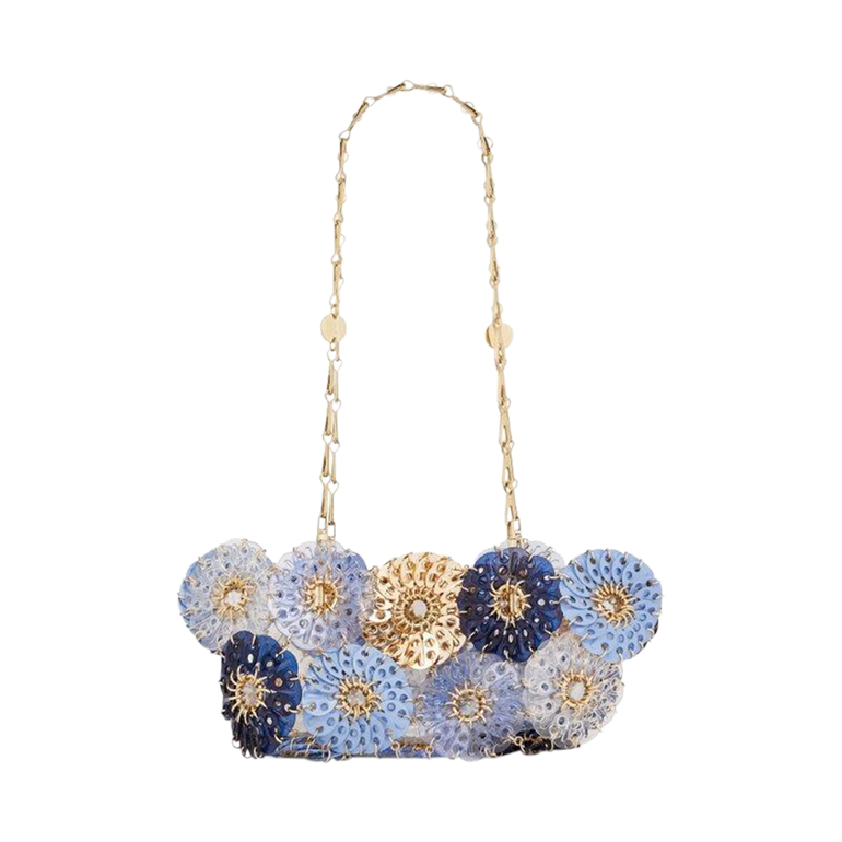 Silver/orange tone and Blue/gold toned flower and disc baguette bag.
