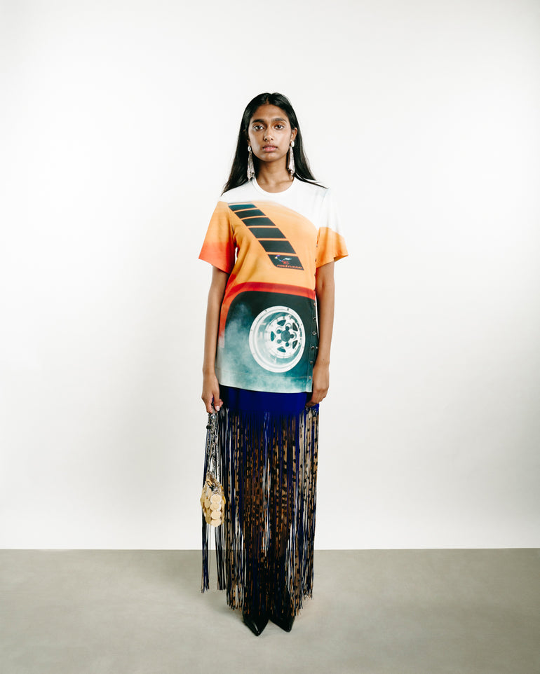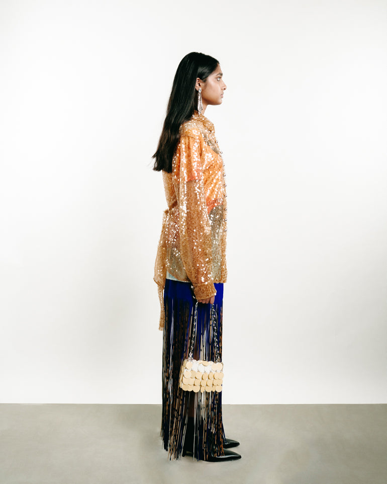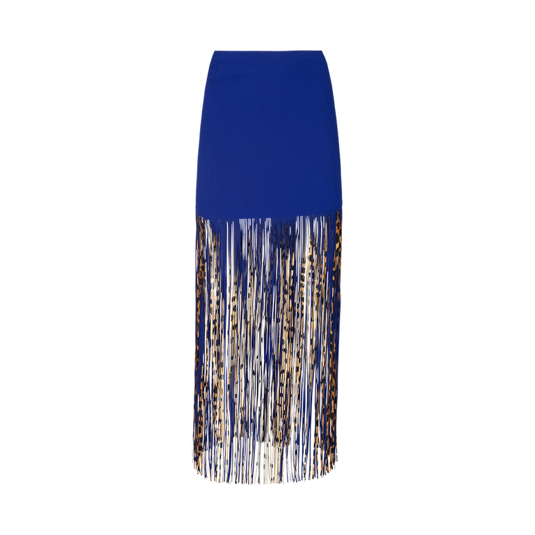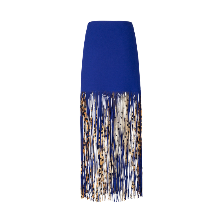 Midi skirt with smooth cady base, long fringe with printed pattern and concealed side zip.
