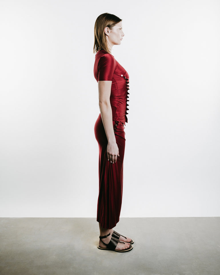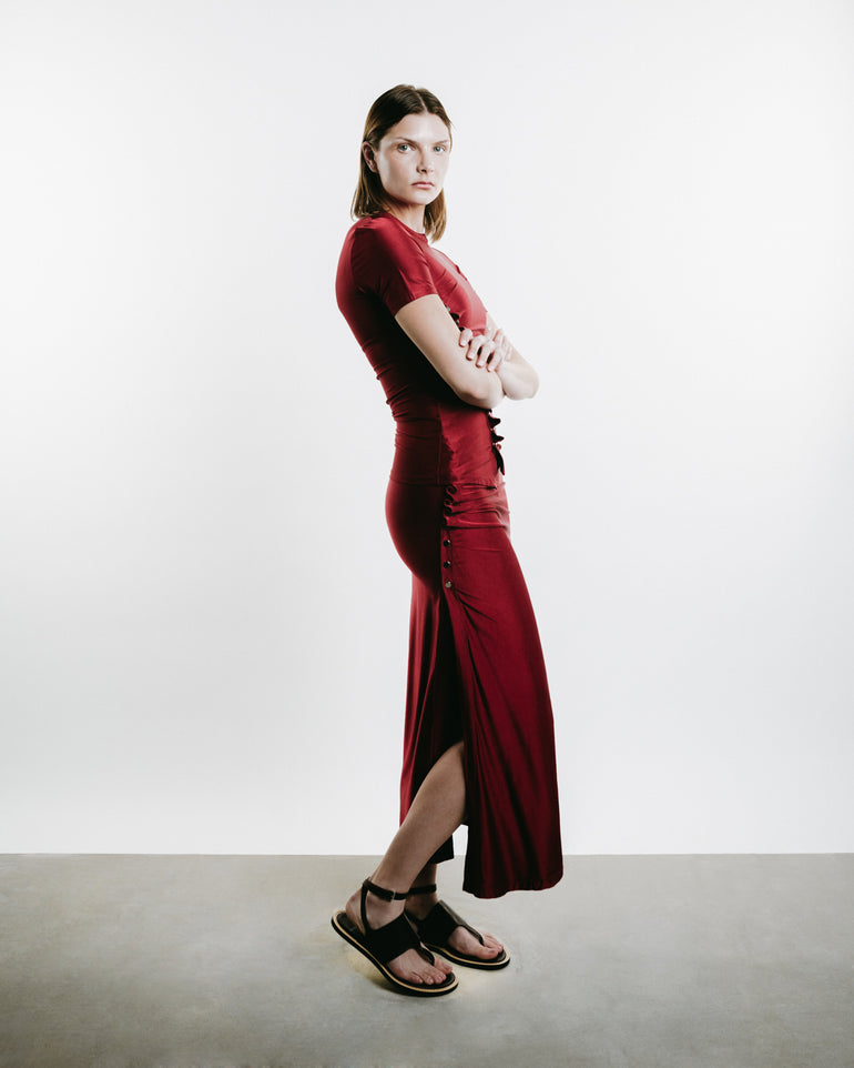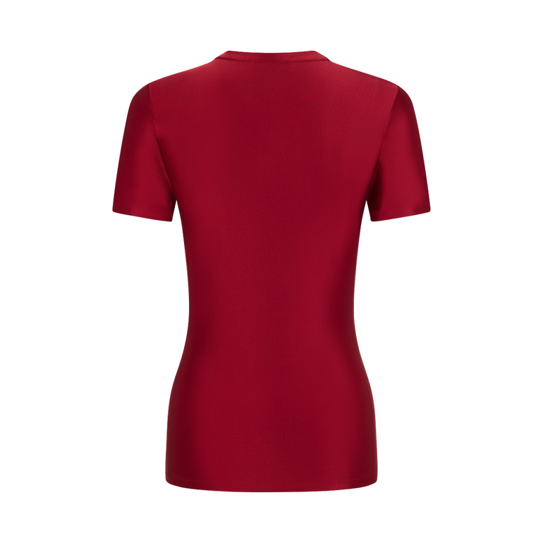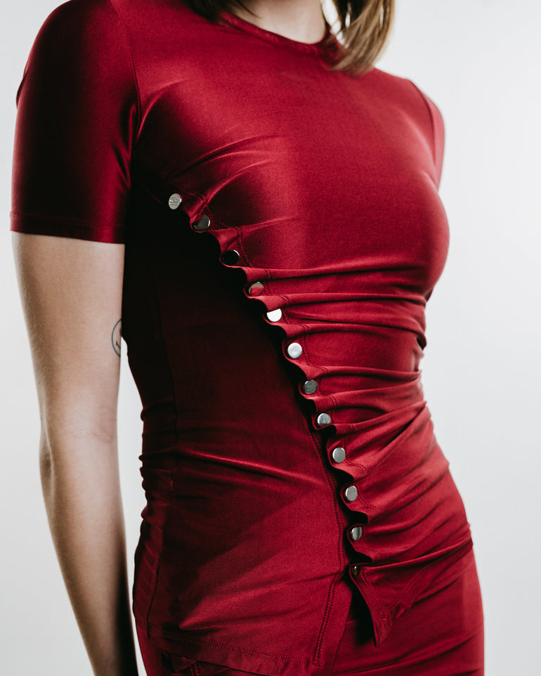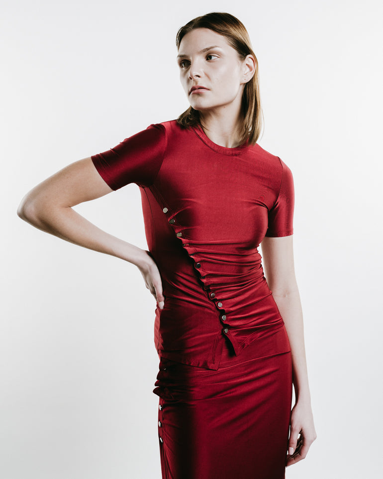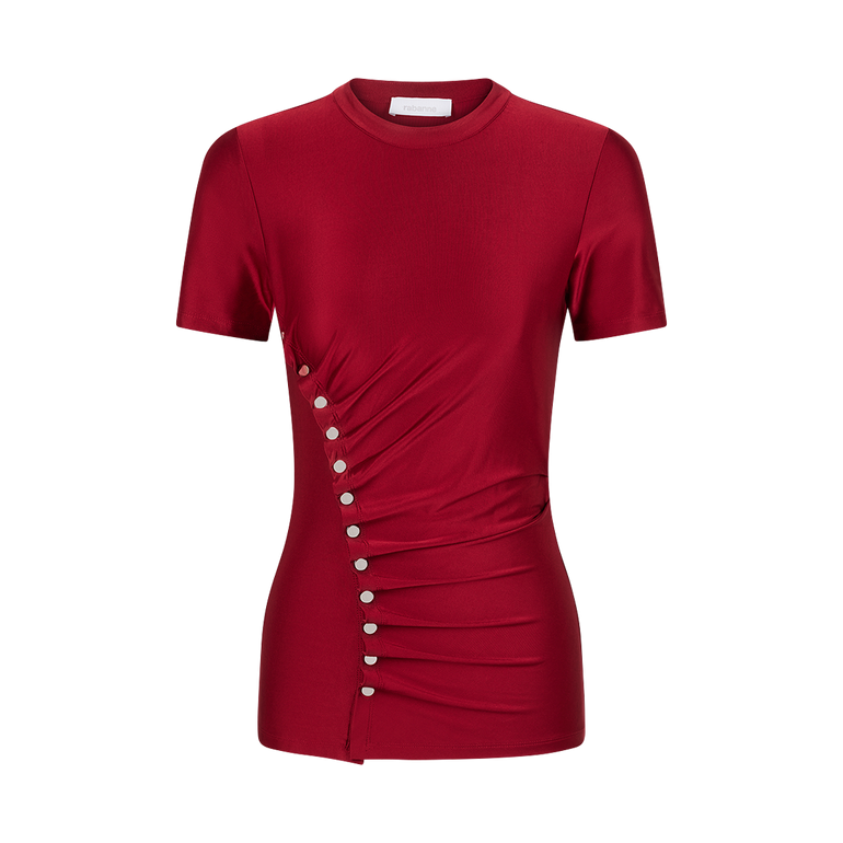 Fitted top with snap ruching detail, crew neckline and short sleeves.