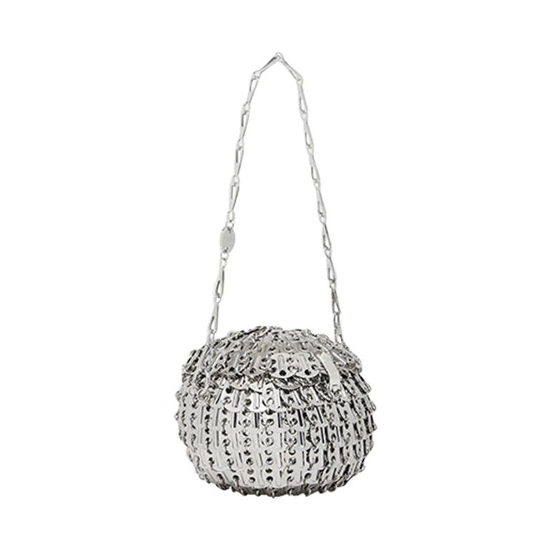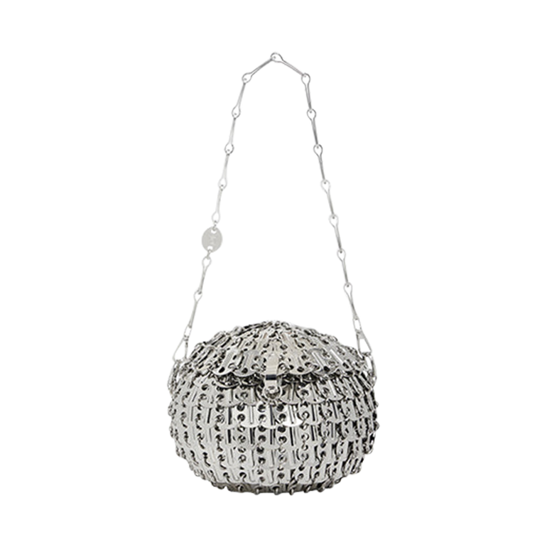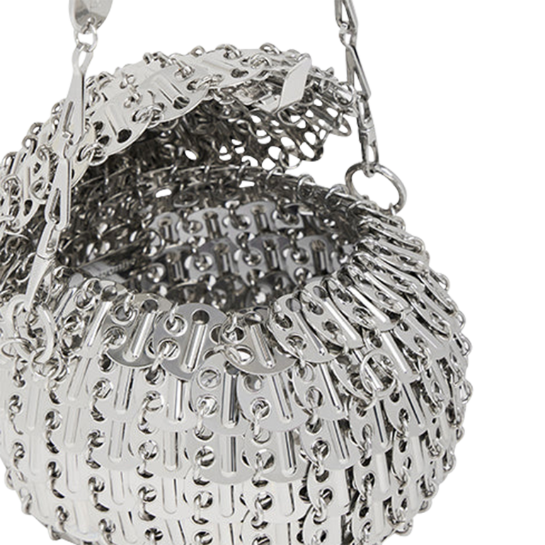 Bag made with 282 metal discs, featuring top flap opening, latch closure and chain shoulder strap. Approx. 5.3"DIA.