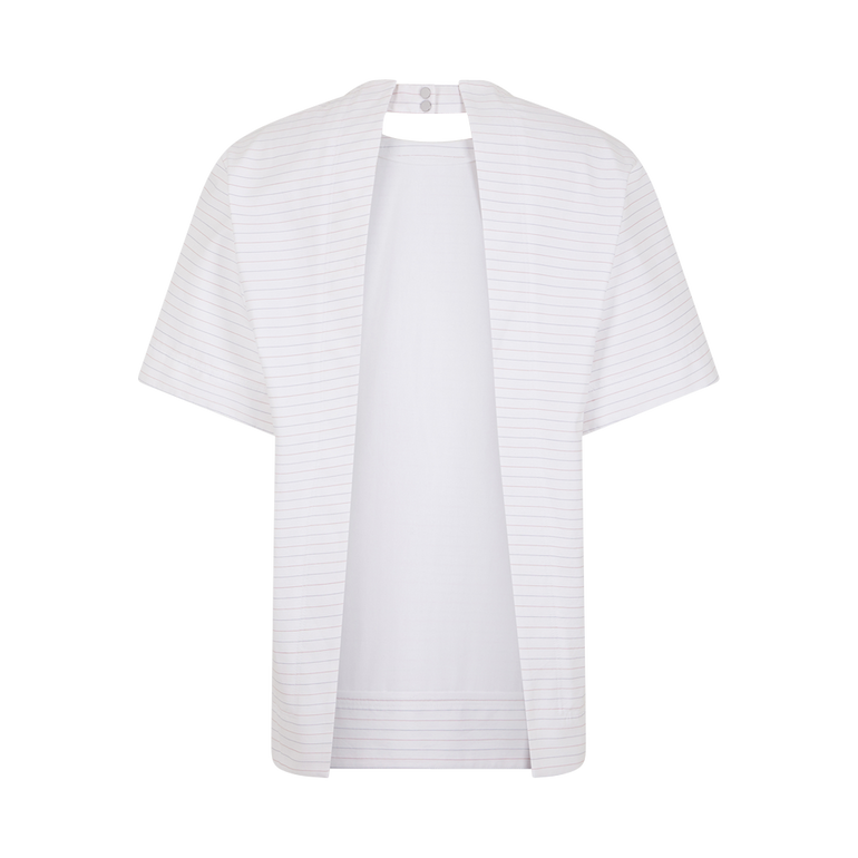 Top with round neckline, short sleeves and open back with button closure.