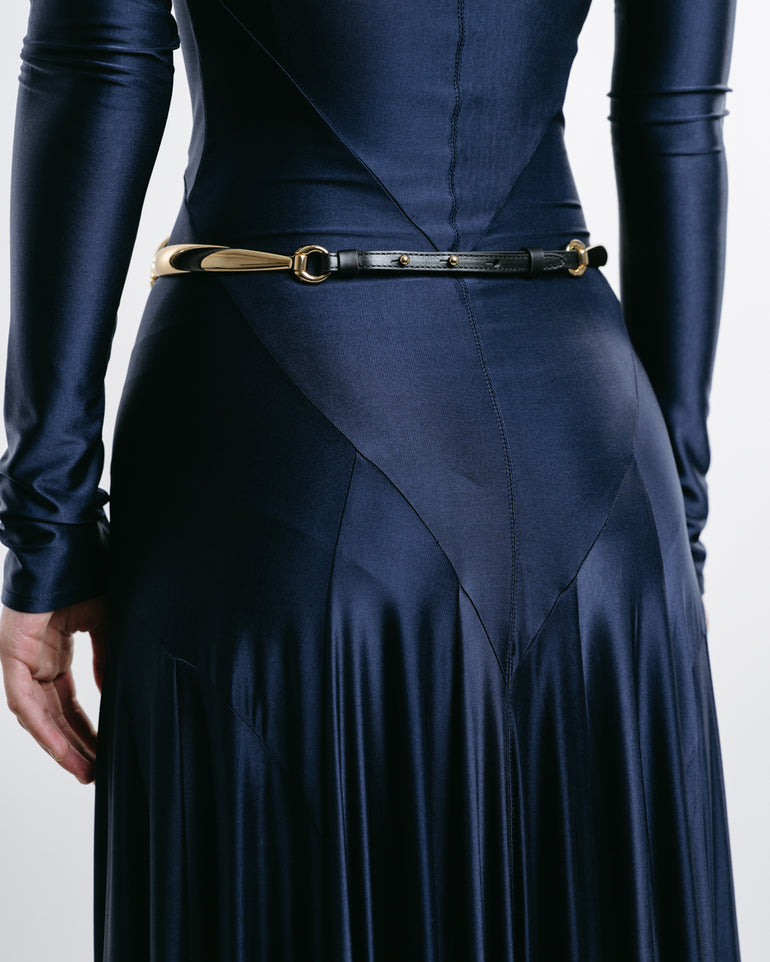 Ring belt composed of two leather straps connected by gold-tone metal links.