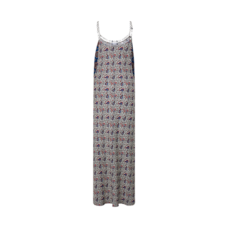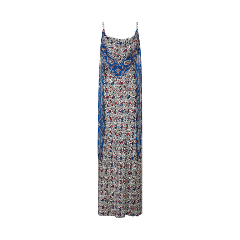 A scoop neckline and gold chain straps. Maxi length with allover bandana paisley print.