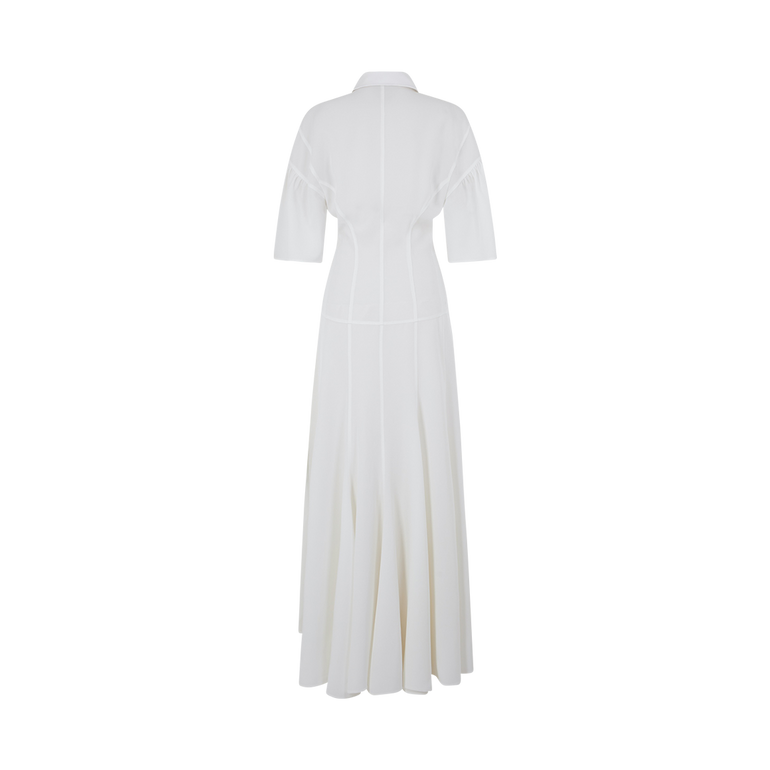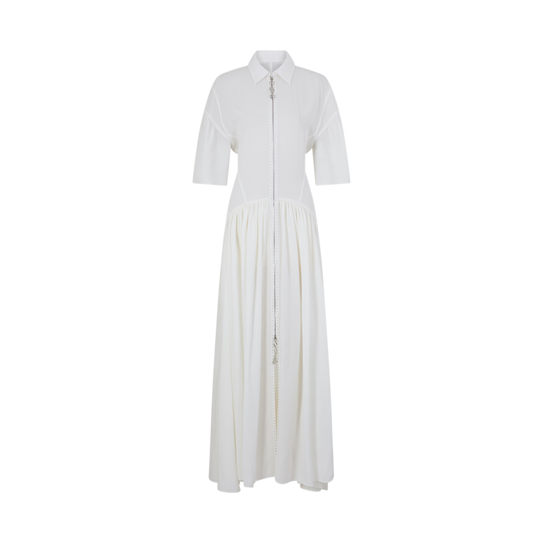Short-sleeved dress with collar, zip front and ankle-length hem.