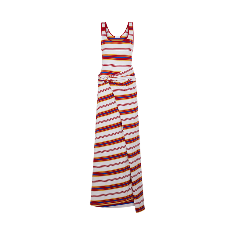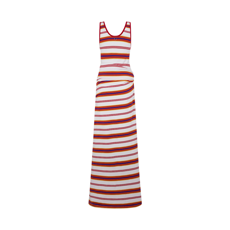 Sleeveless, ankle-length dress with crew neckline and straight silhouette. Finished with contrast stripe pattern throughout. Silver piercing detail at the waist.