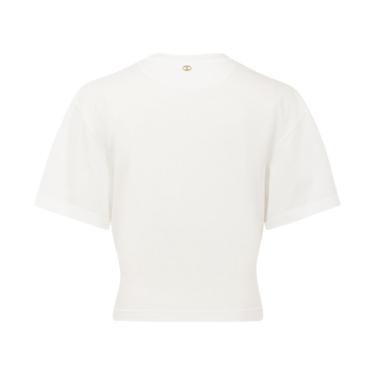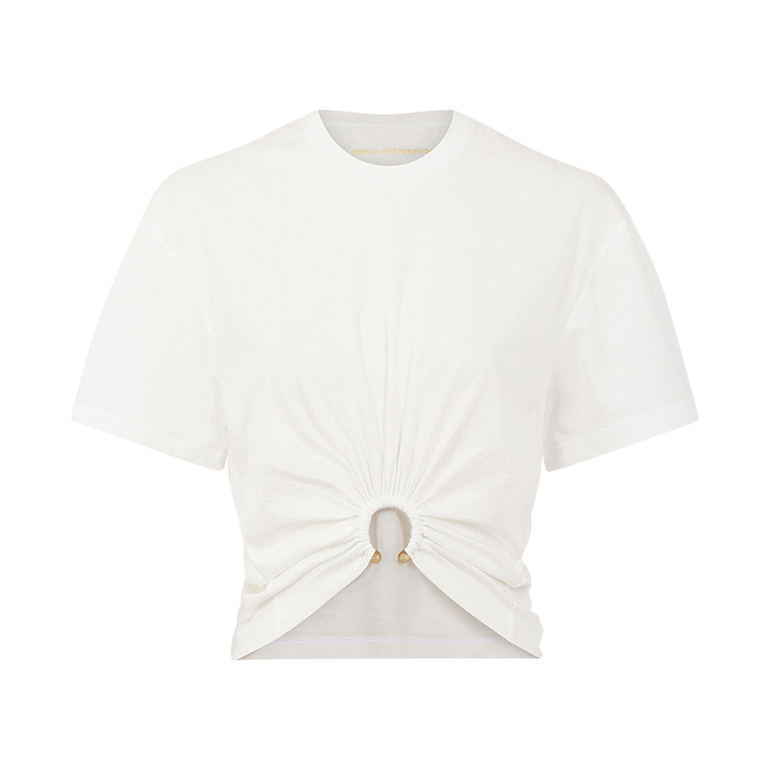 Crewneck short-sleeved tee. Cropped length. Silver piercing detail on the front.