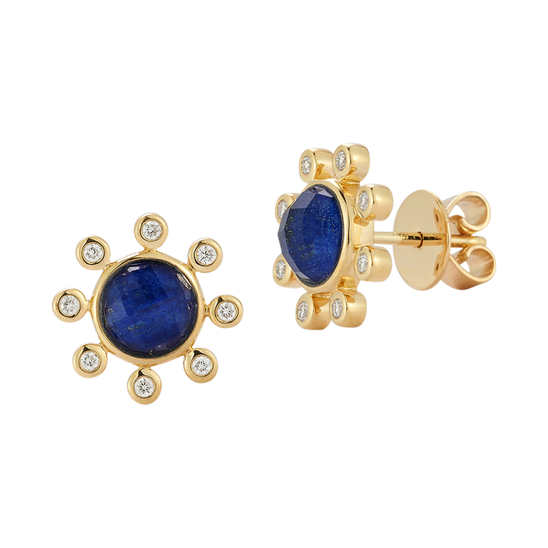 Stud earrings featuring rock crystal backed by lapis lazuli and surrounded by .14 CT. T.W. diamond accents. For pierced ears.