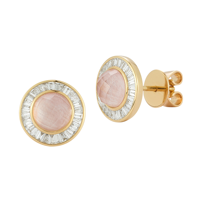 Stud earrings with pink opal center stones surrounded by .50 CT. T.W. diamonds. For pierced ears.