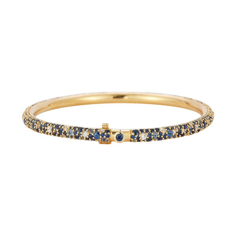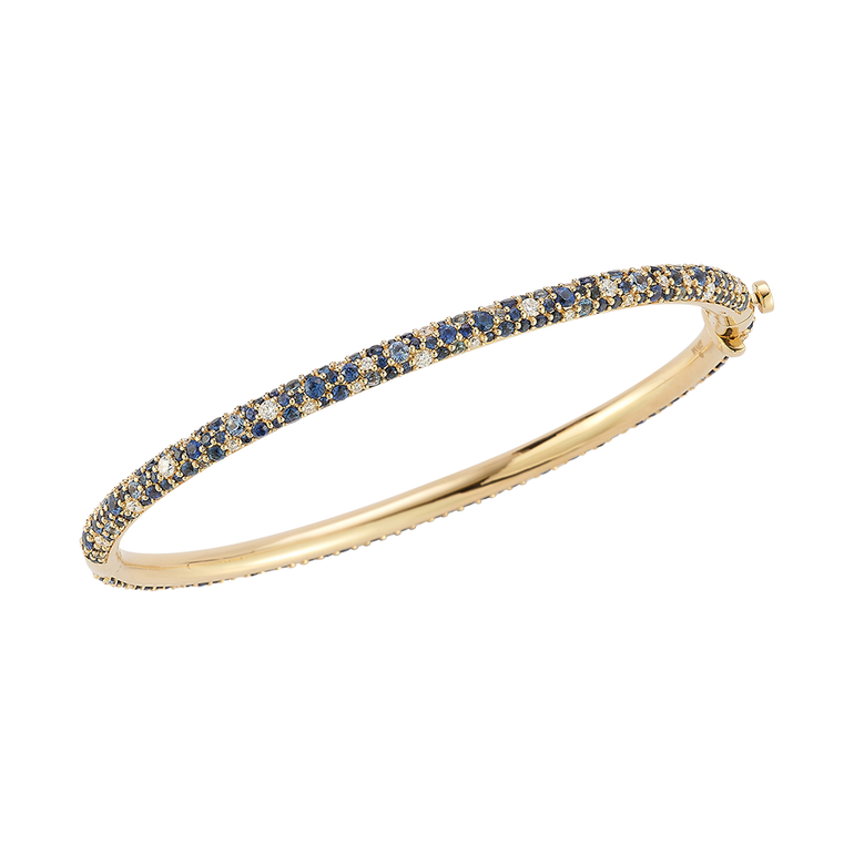 Bangle bracelet with 3.26 CT. T.W. blue sapphire and .65 CT. T.W. diamonds. Sizes 15-18.