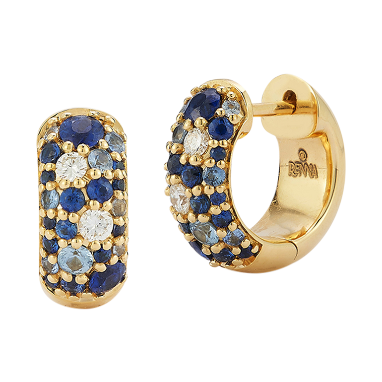 Huggie hoop earrings with 1.32 CT. T.W. sapphire and .11 CT. T.W. diamonds. For pierced ears.