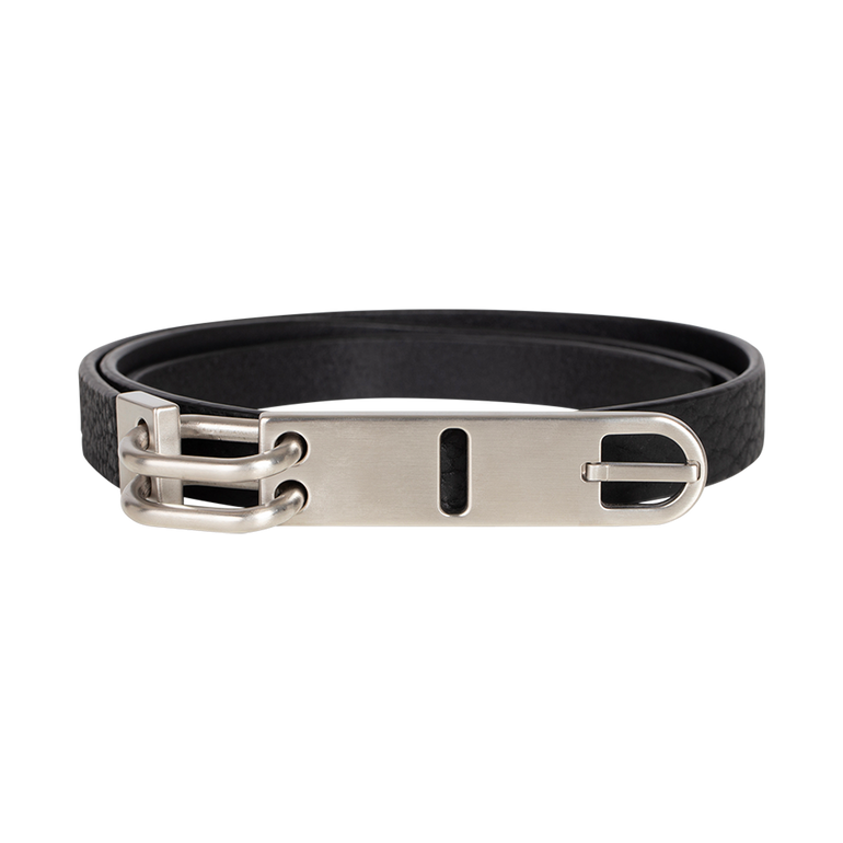 Belt with brass buckle secured by two chain link details.