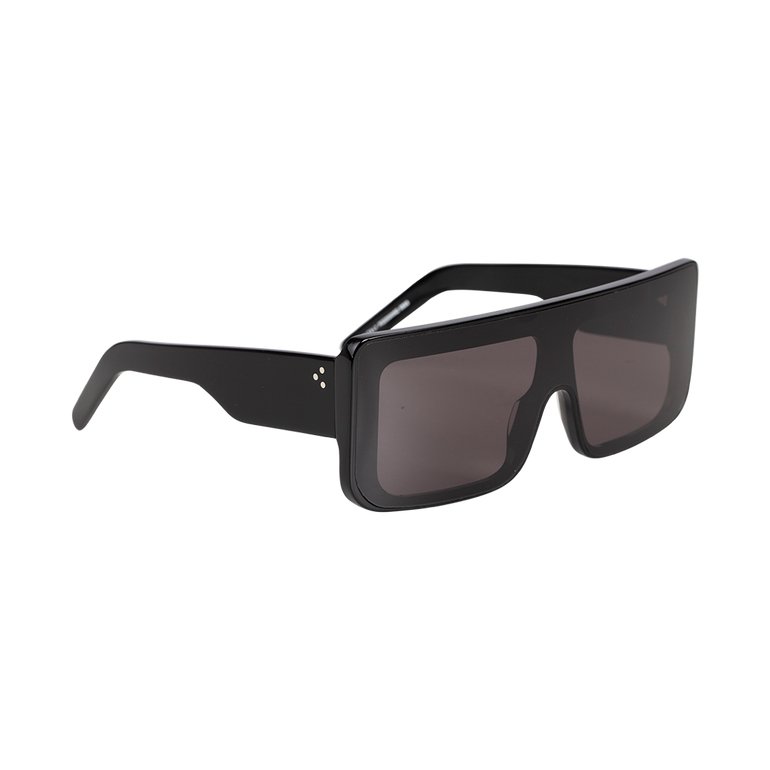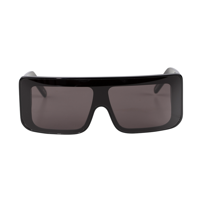 Sunglasses with large rectangular frame, single-cut lens and wide arms with signature trio of silver rivets on each temple.