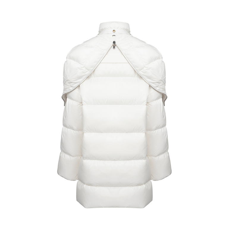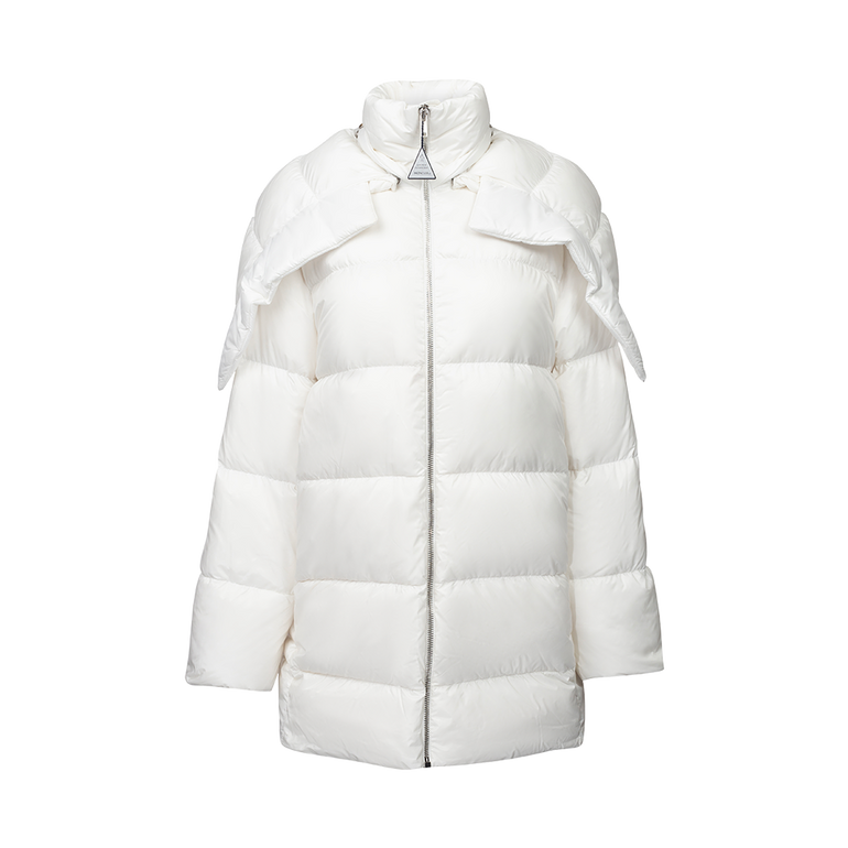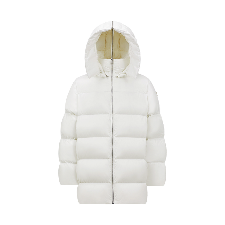 Padded coat with stand-up collar, detachable tonal zipped hood, front zip, side pockets and straight hem.