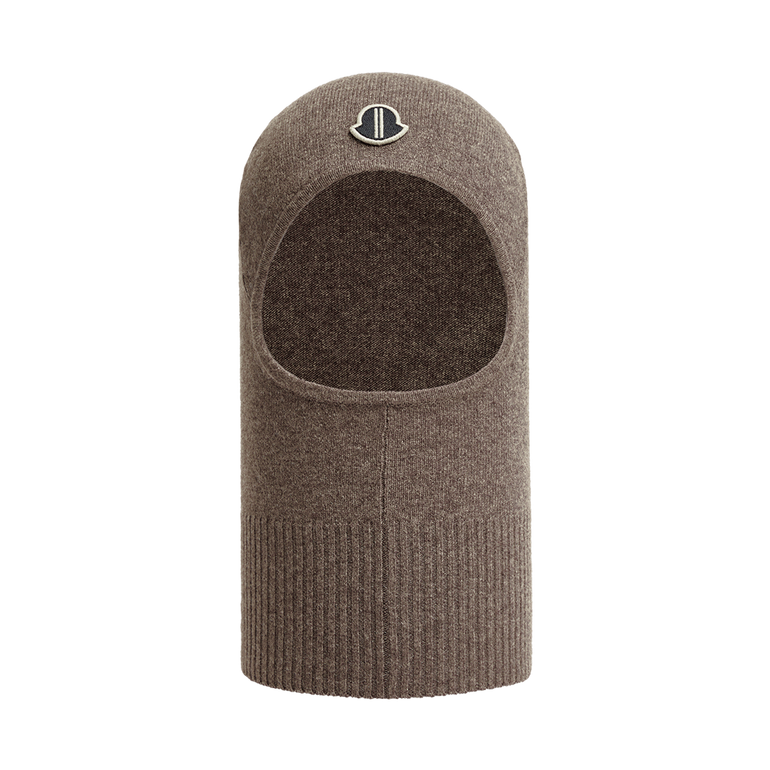Moncler x Rick Owens balaclava hat with front eye-hole and logo patch.