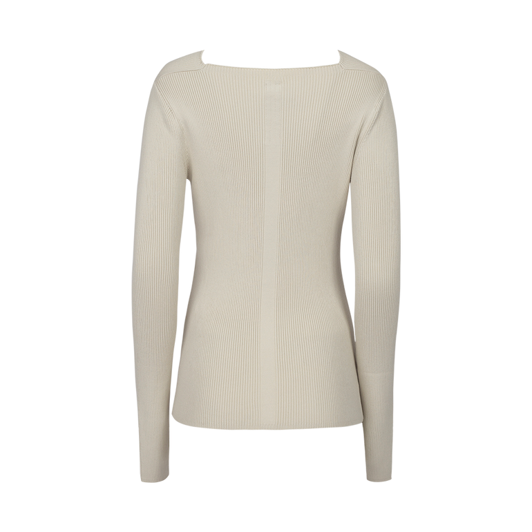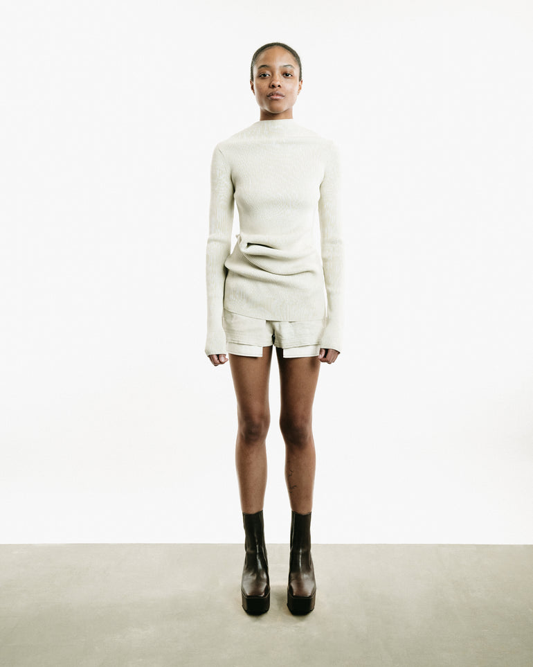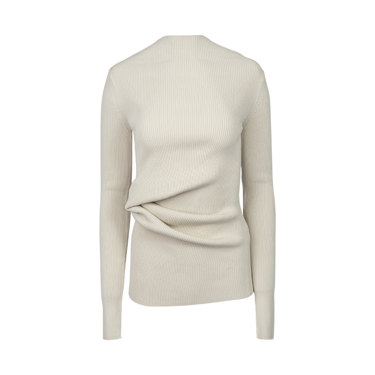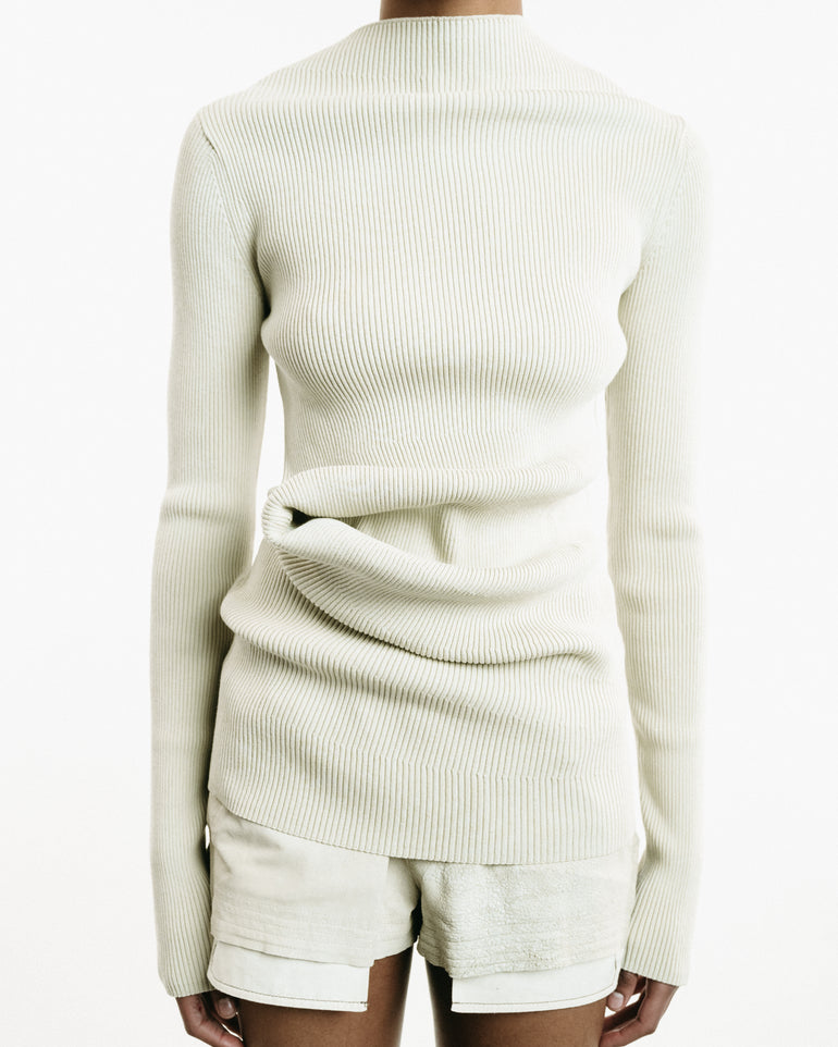 Lightweight ribbed-knit top with high neckline, long sleeves and asymmetric hem.