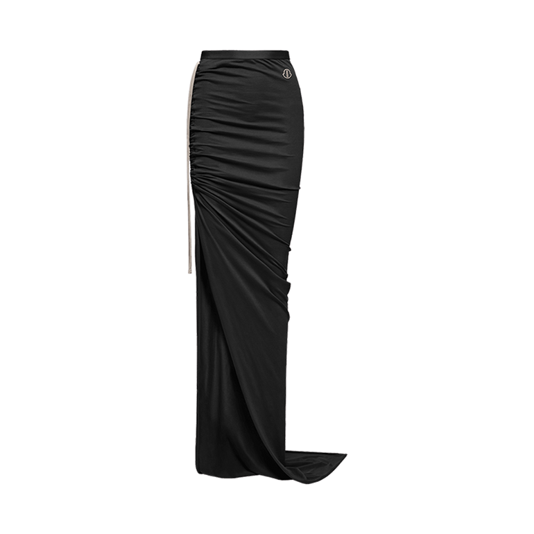 Floor-length adjustable skirt in mediumweight cotton jersey with a slim fit, elasticized waistband, right-leg slit with drawstring for adjustable draping and ruching. Wraps around the hips with a left-side train.