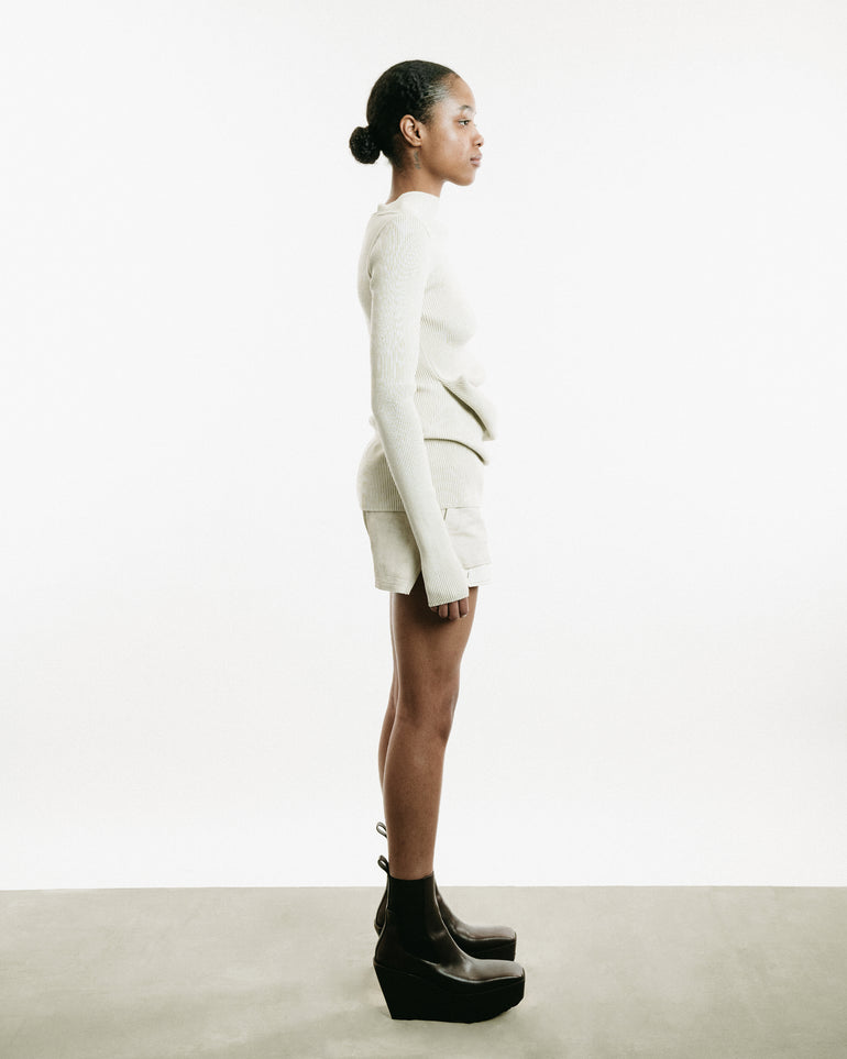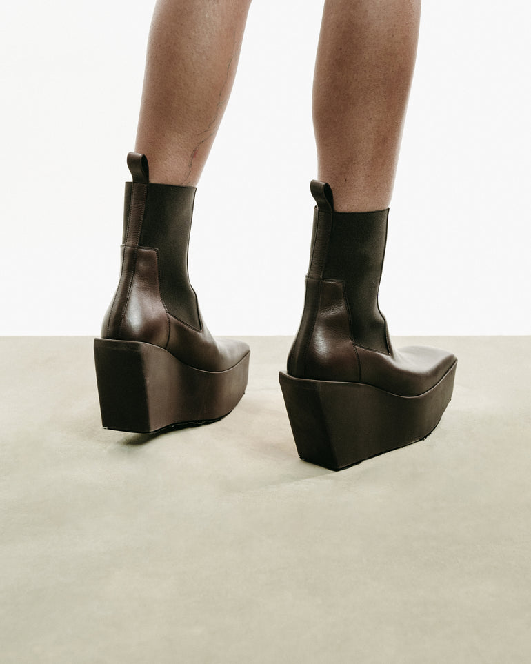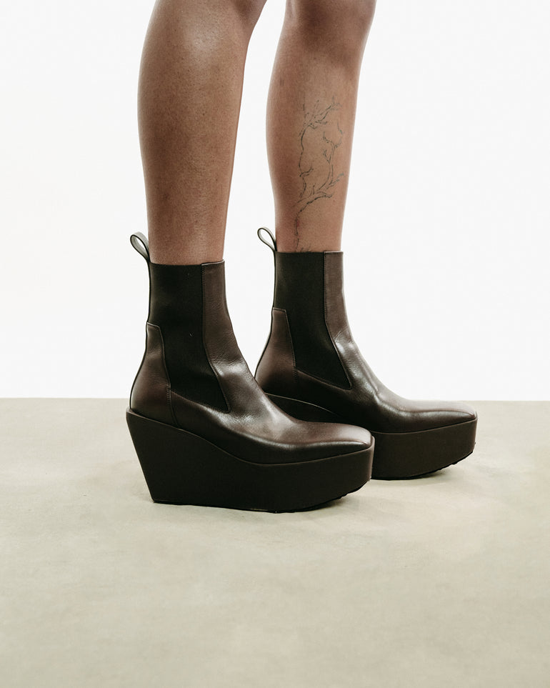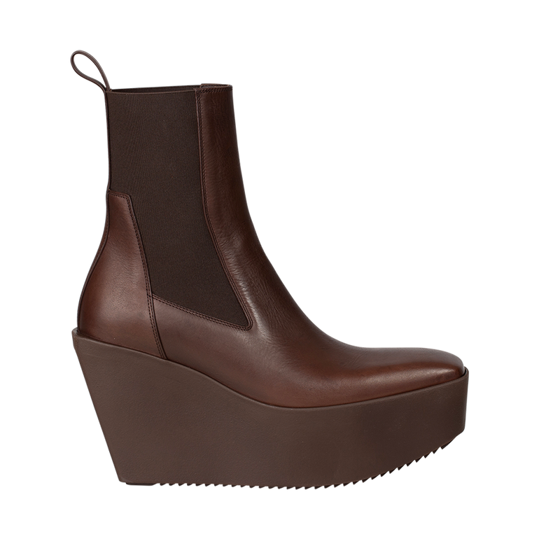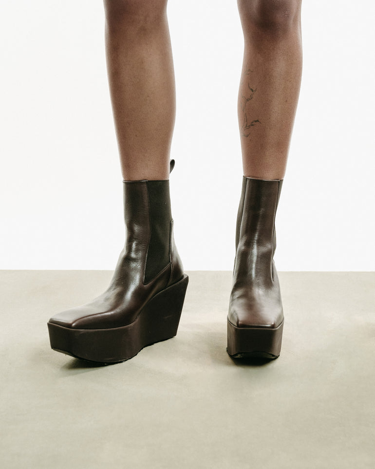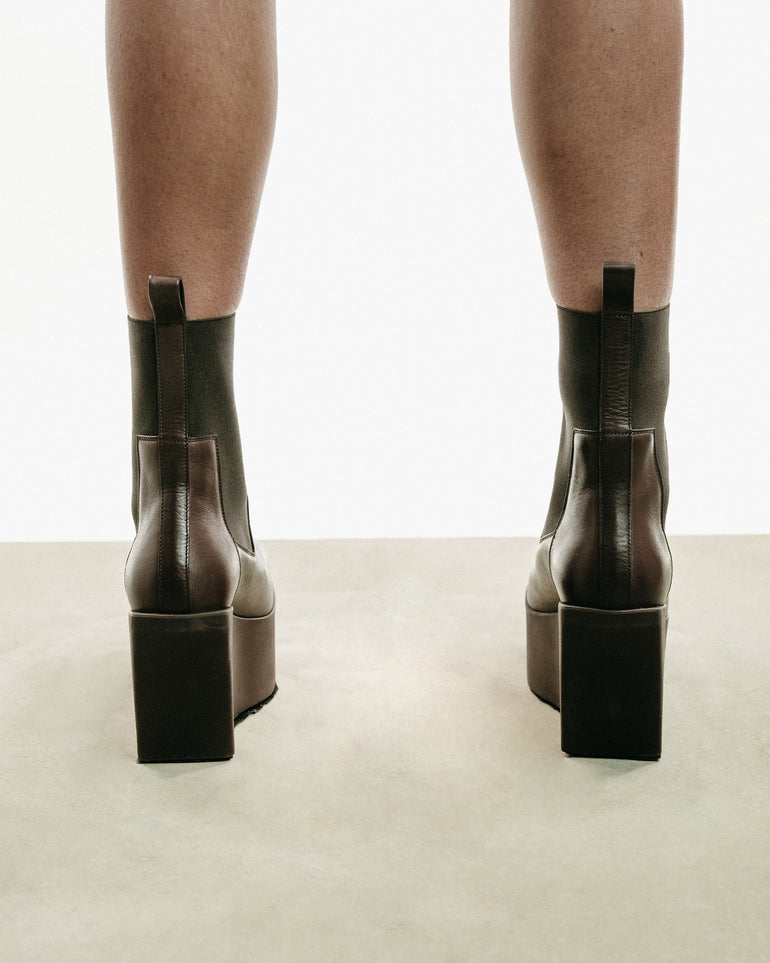 Brown (mahogany) leather. Above-ankle height boot with side panels in stretch elastic, square toe and platform sole. Calf leather.Made in Italy.