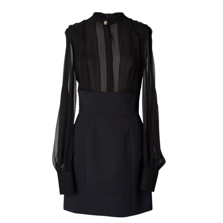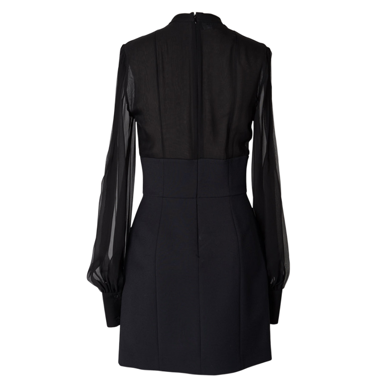 Long sleeve mini dress with round neckline joined by gold detailing and sheer panels.