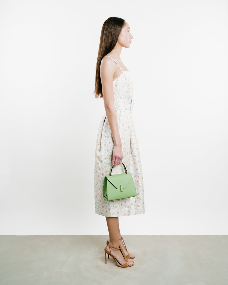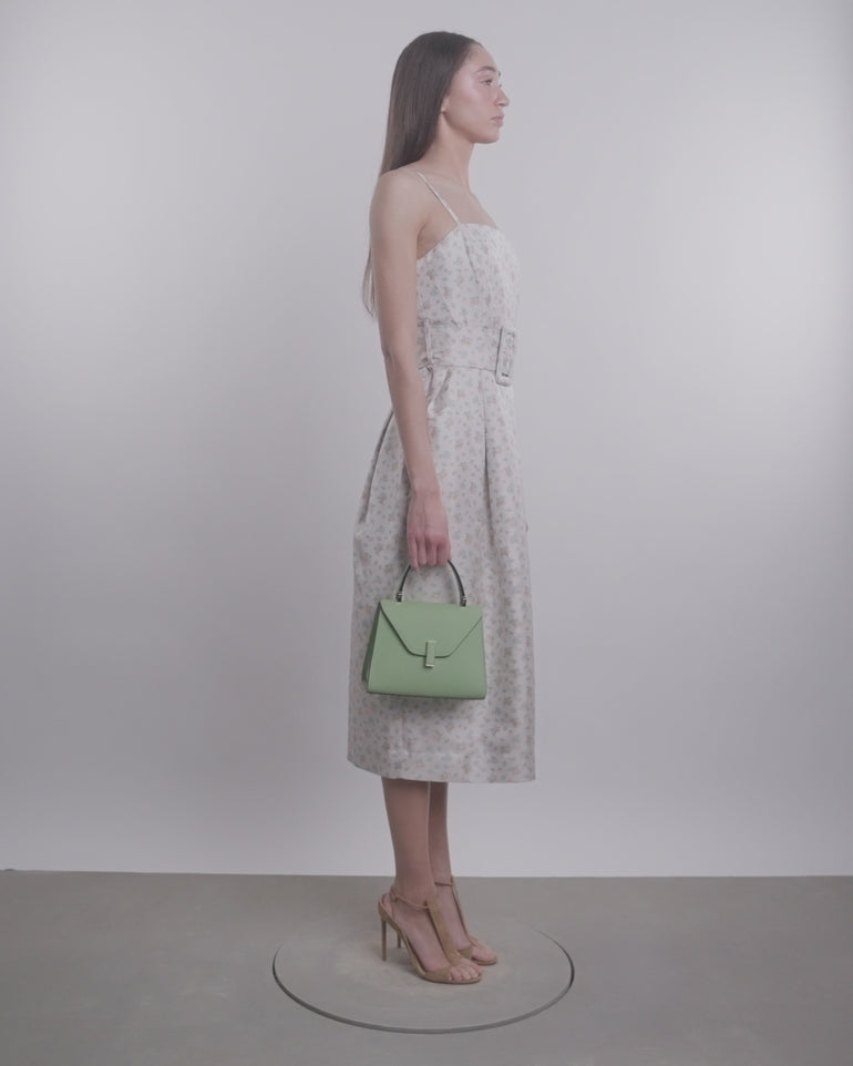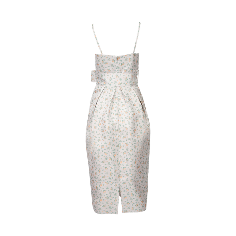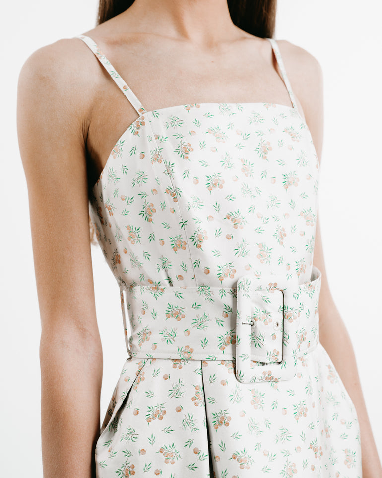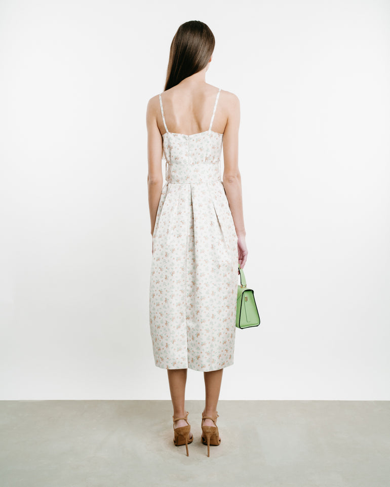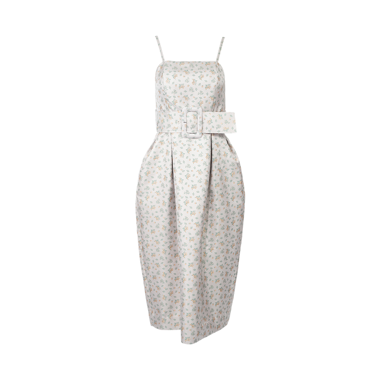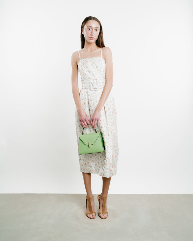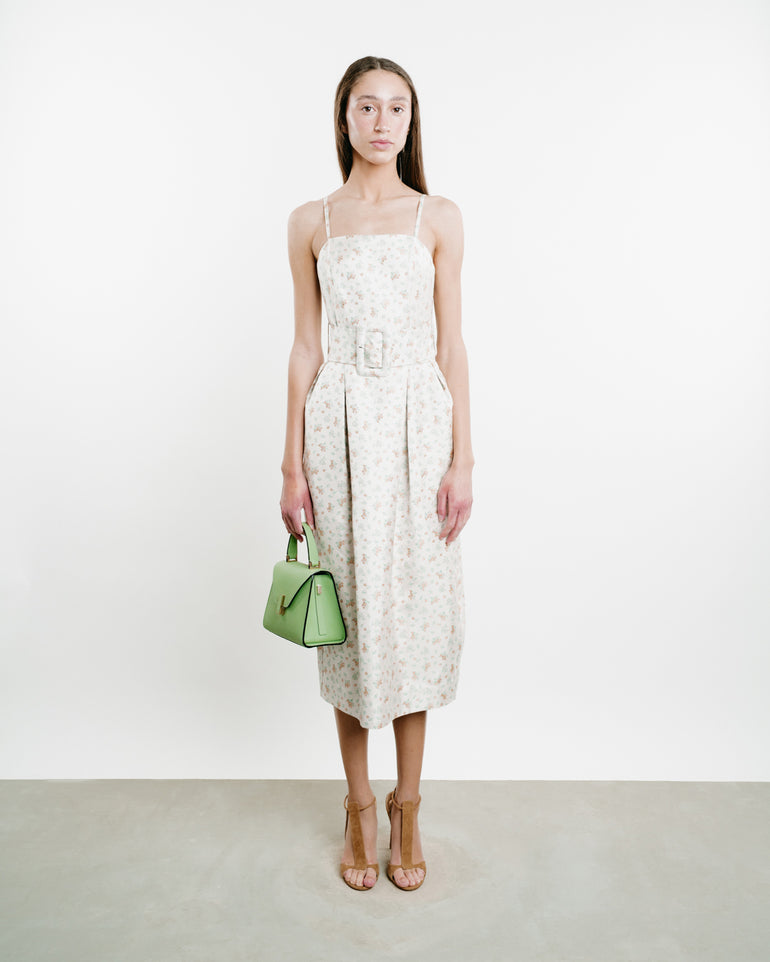 Midi dress with slim straps, structured neckline, wide self-belt and zip closure.
