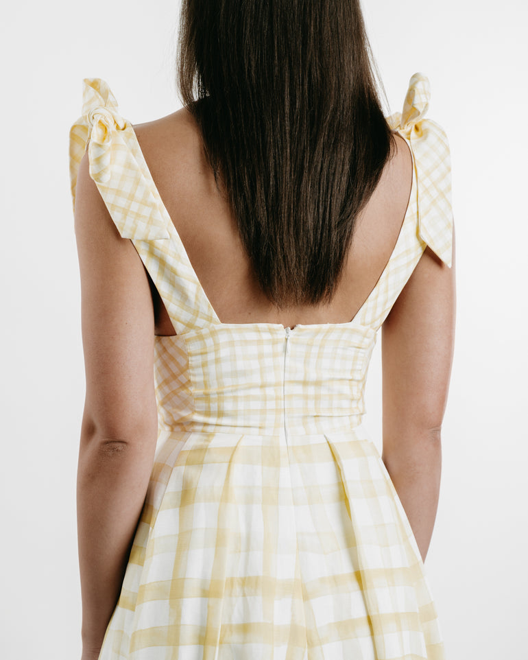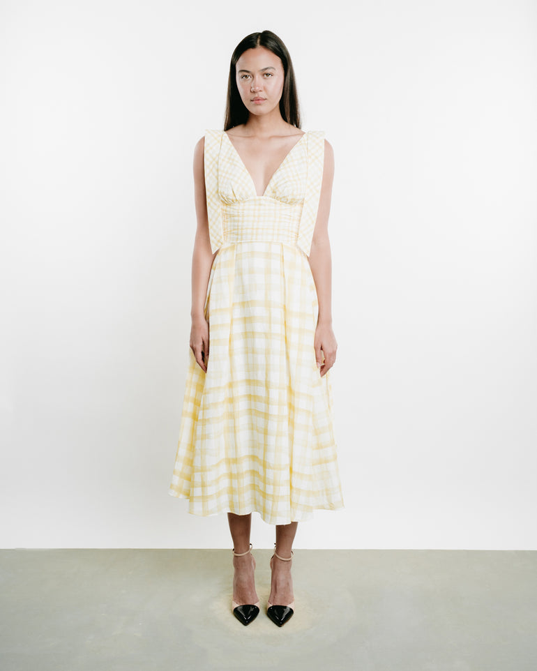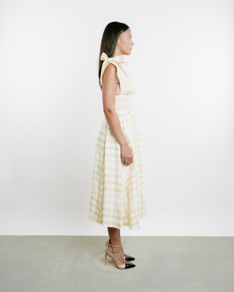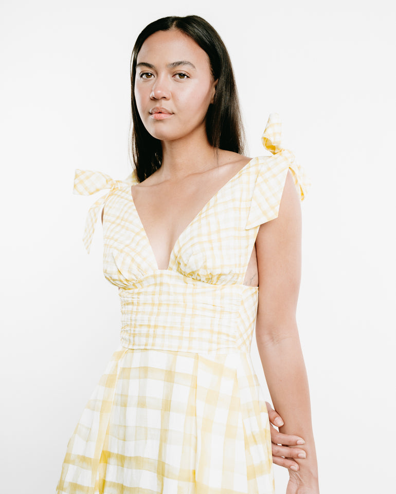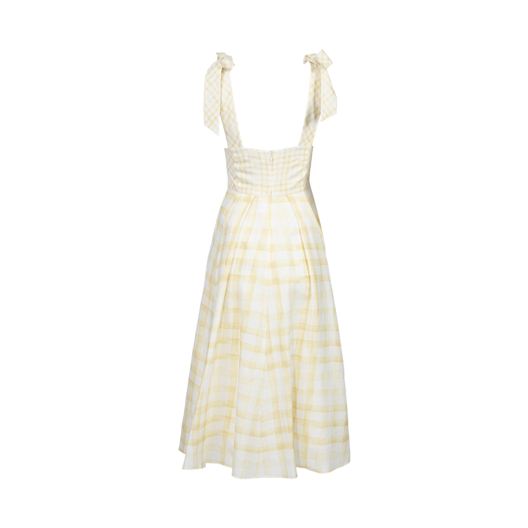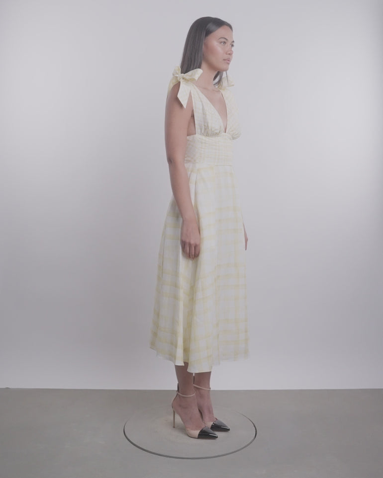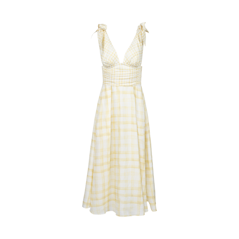 Midi dress with V-neckline, self-tie straps, ruched bodice, gathered skirt and zip closure.
