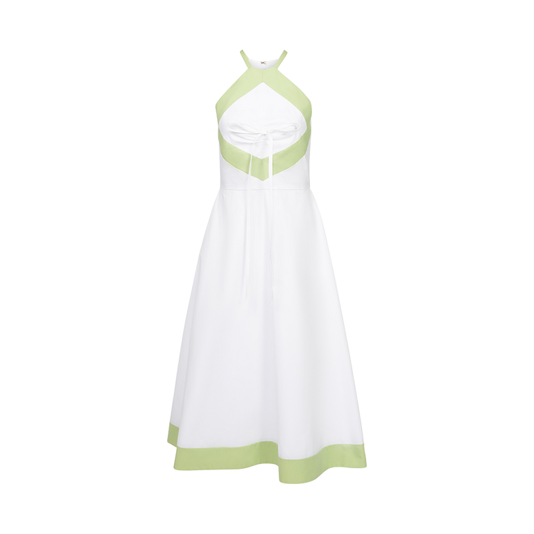 Midi dress with fitted bust/waist, attached bow and concealed back zip. Lined.