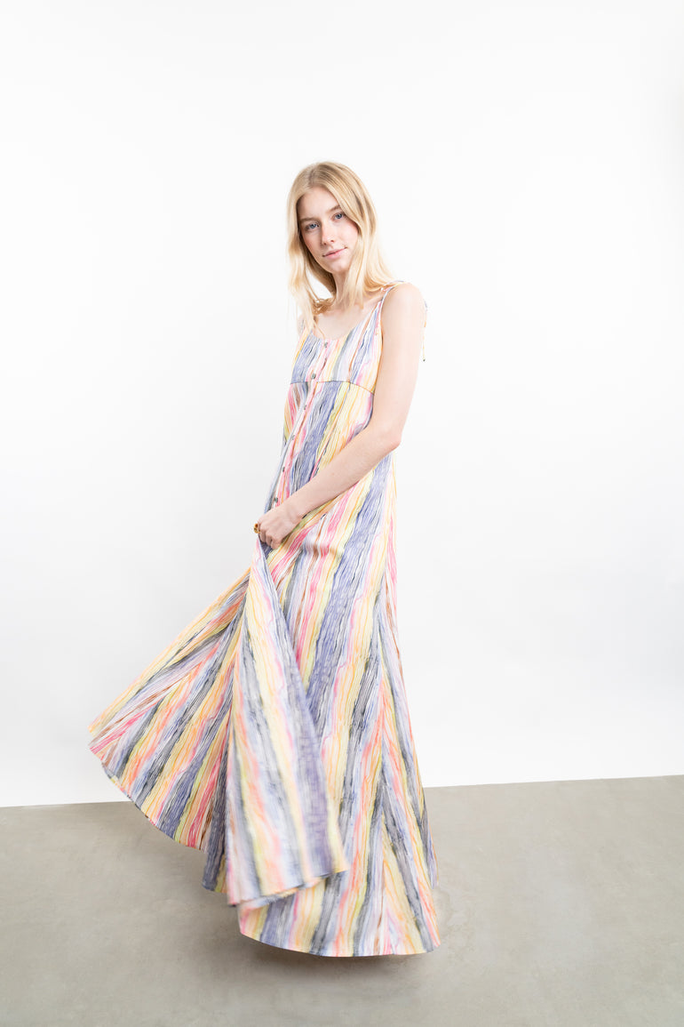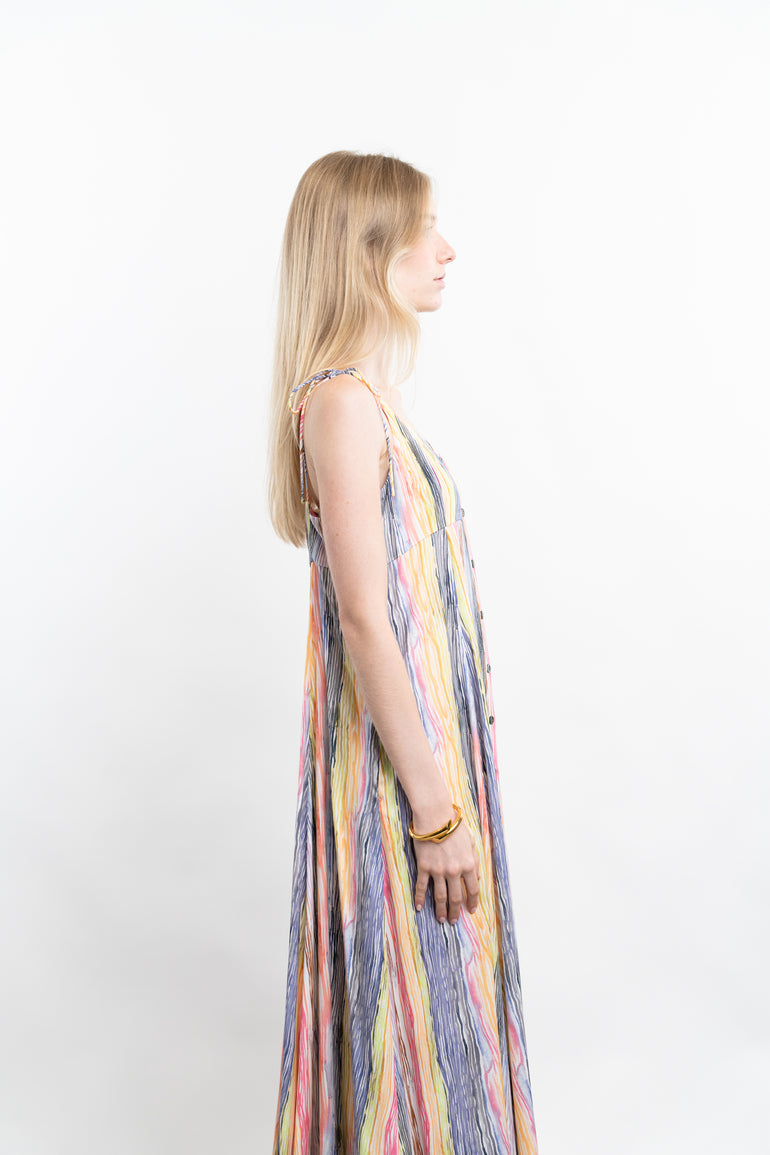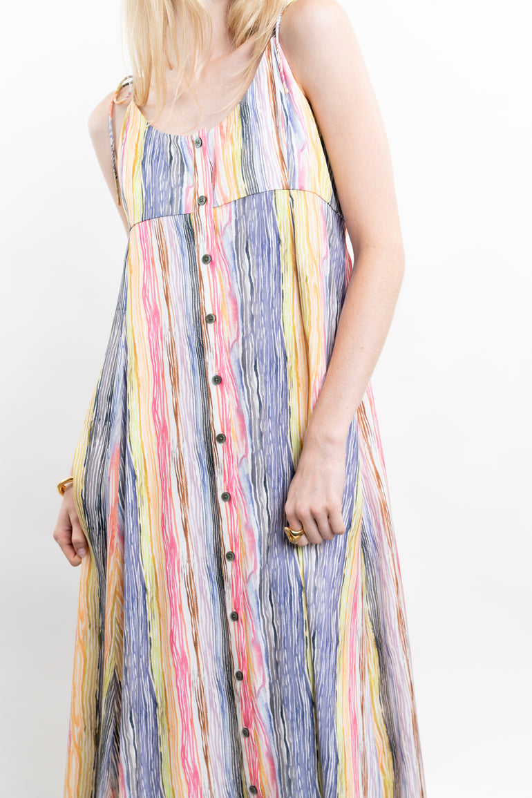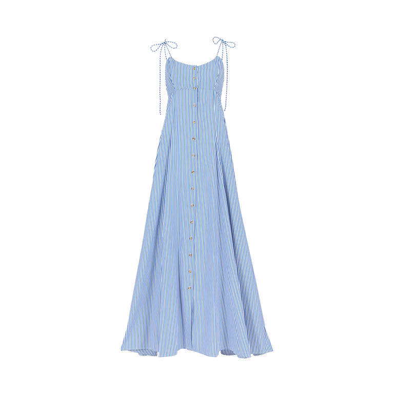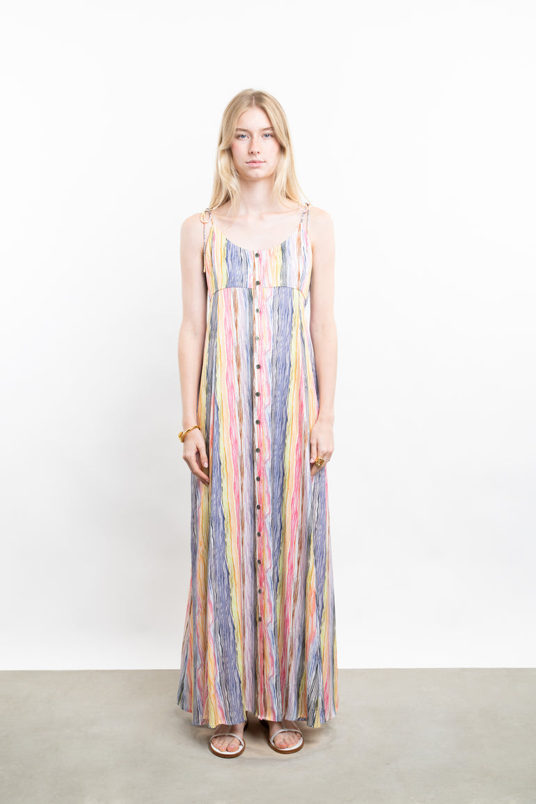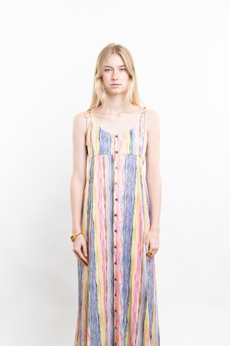 Sleeveless maxi dress with adjustable tie straps, empire waist and full button-down front.
