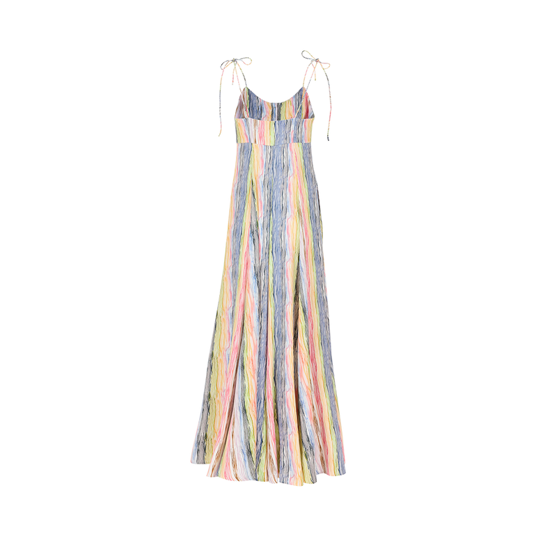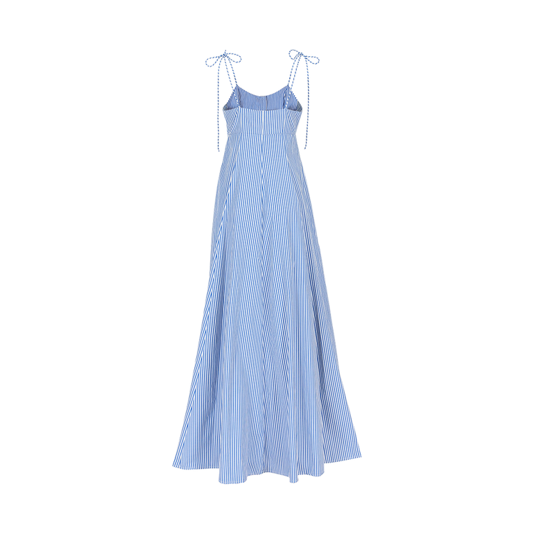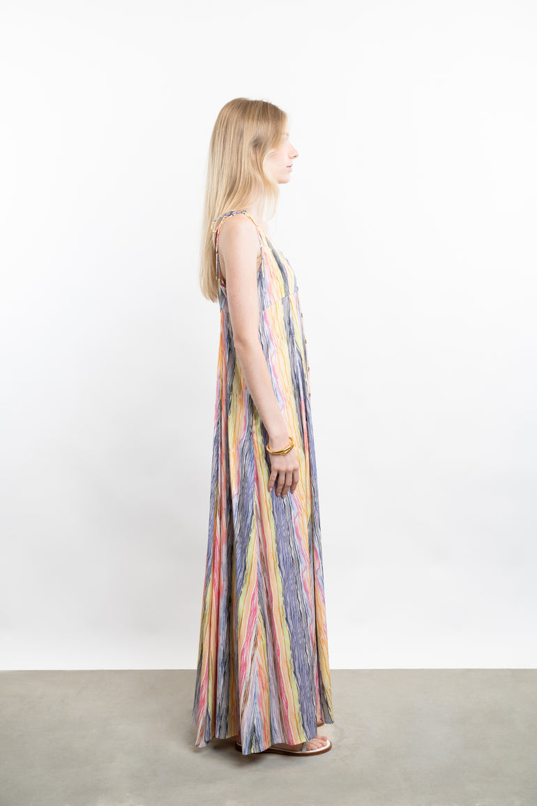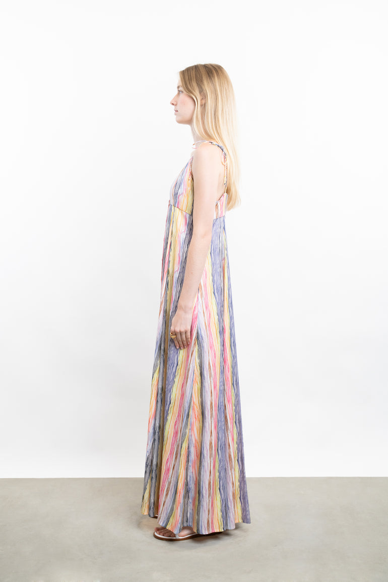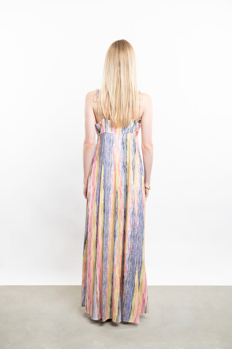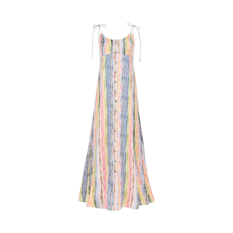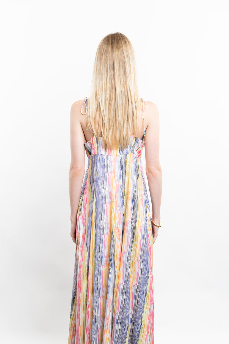 Sleeveless maxi dress with adjustable tie straps, empire waist and full button-down front.
