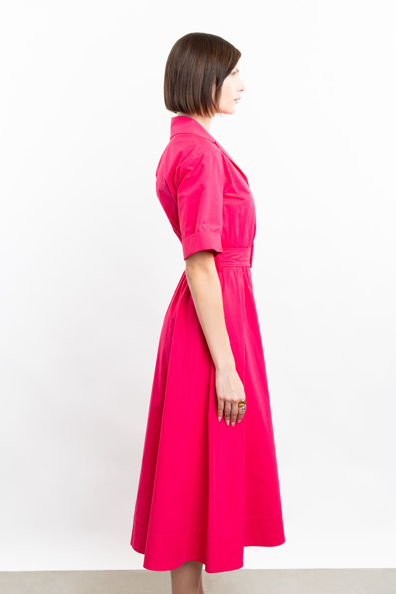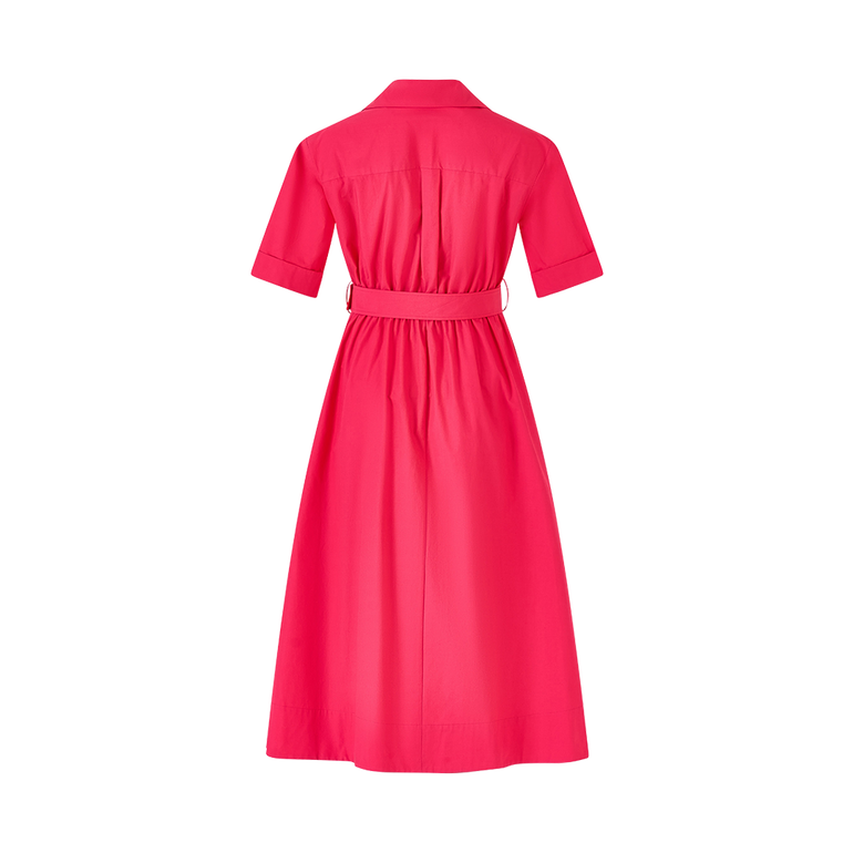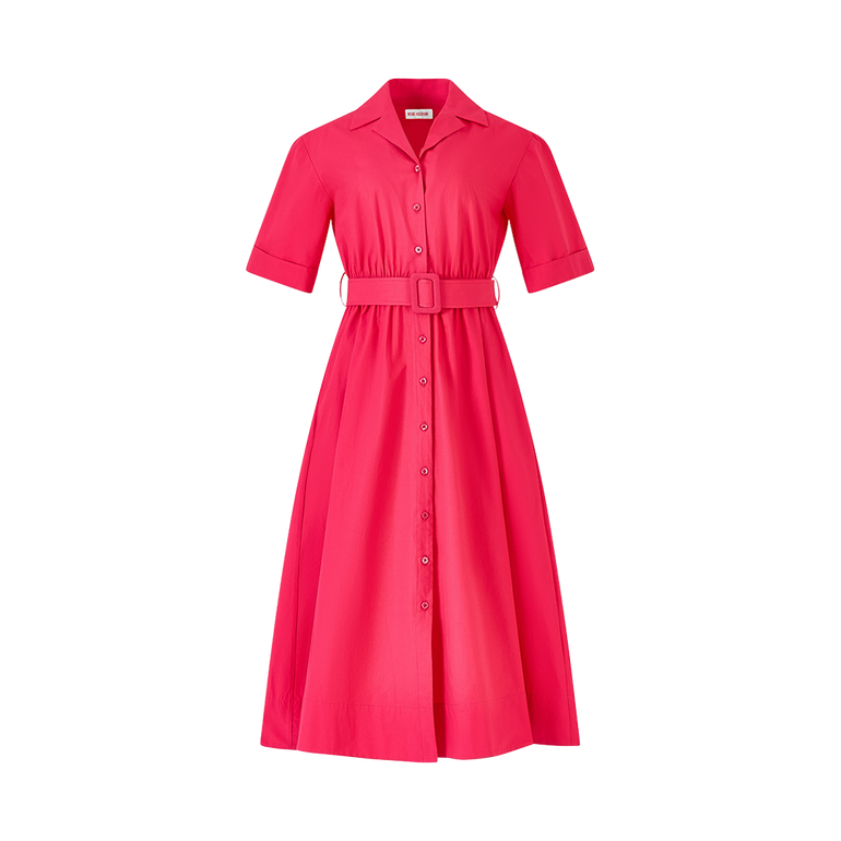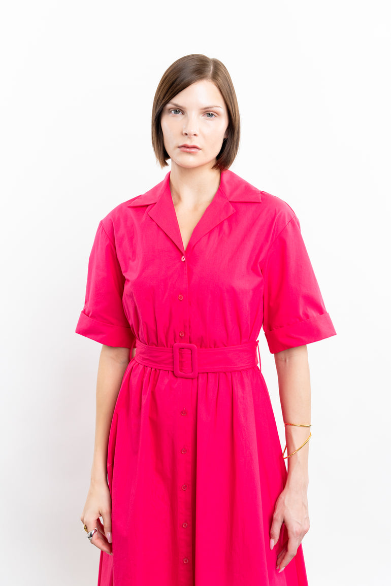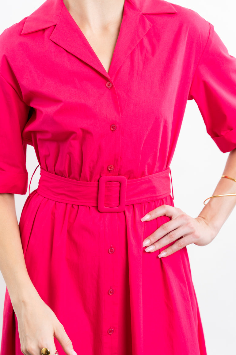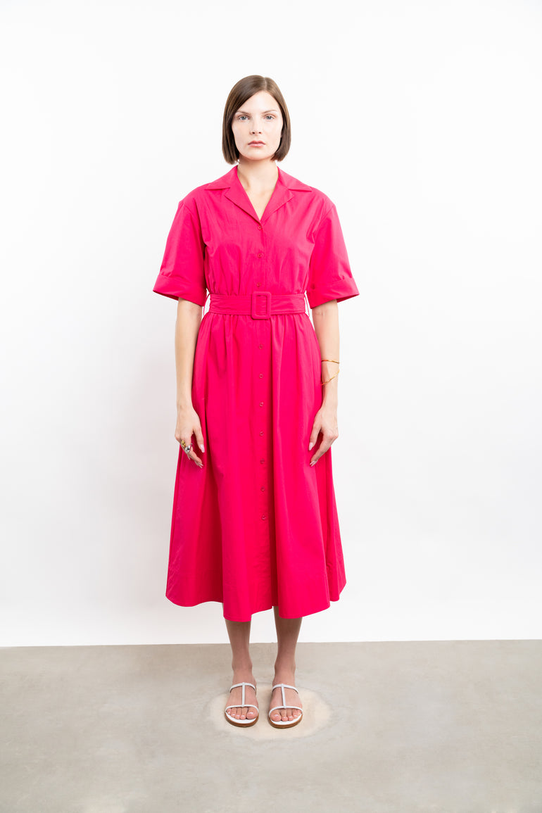 Shirtdress with structured collar, full button-down front and cinched waist with matching belt.