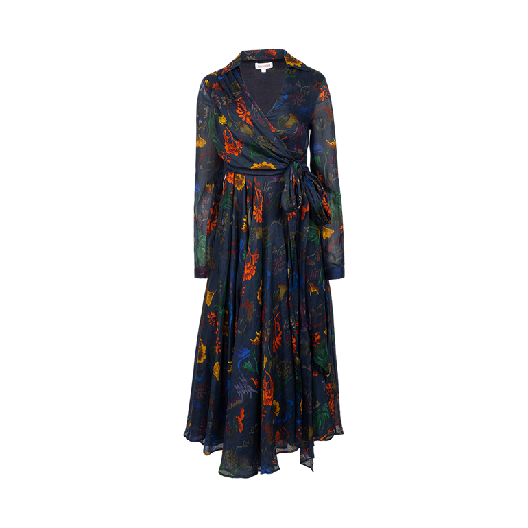 Long-sleeved wrap dress with classic collar, oversized sash and wide skirt.