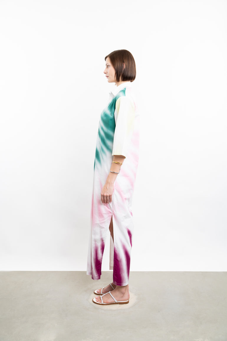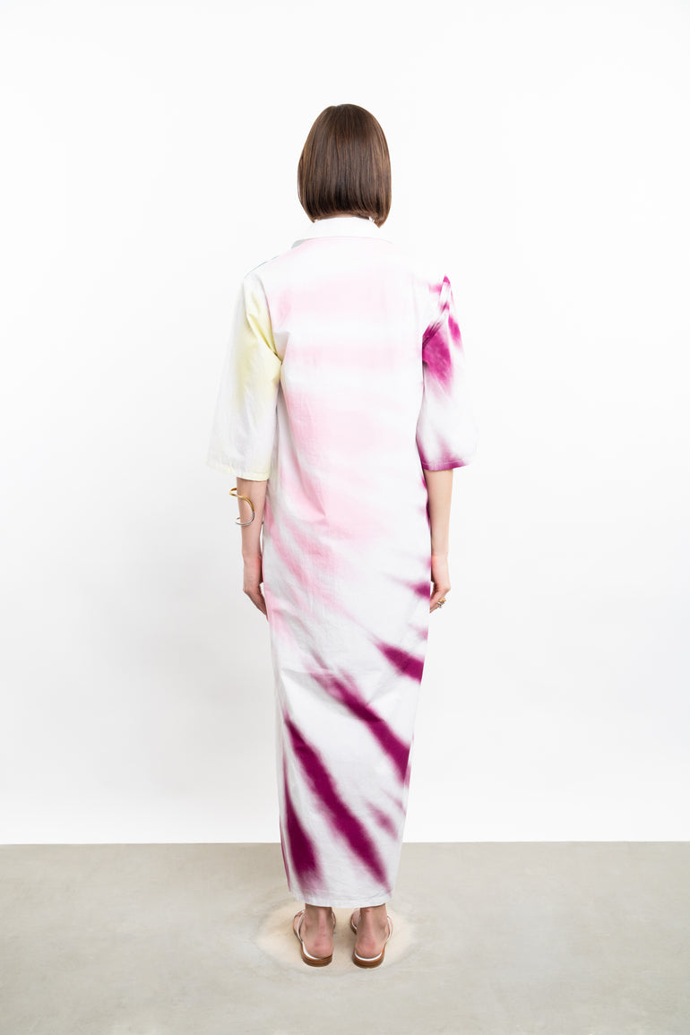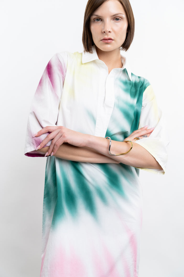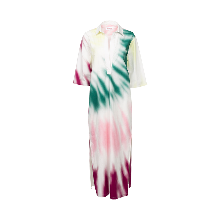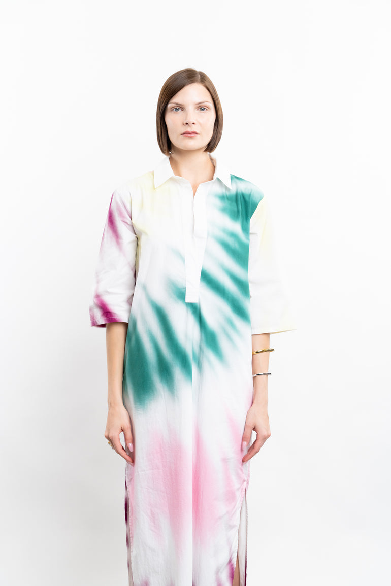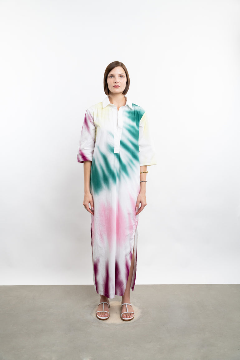 Caftan dress with point collar, V-neckline, short sleeves and T-shirt silhouette.