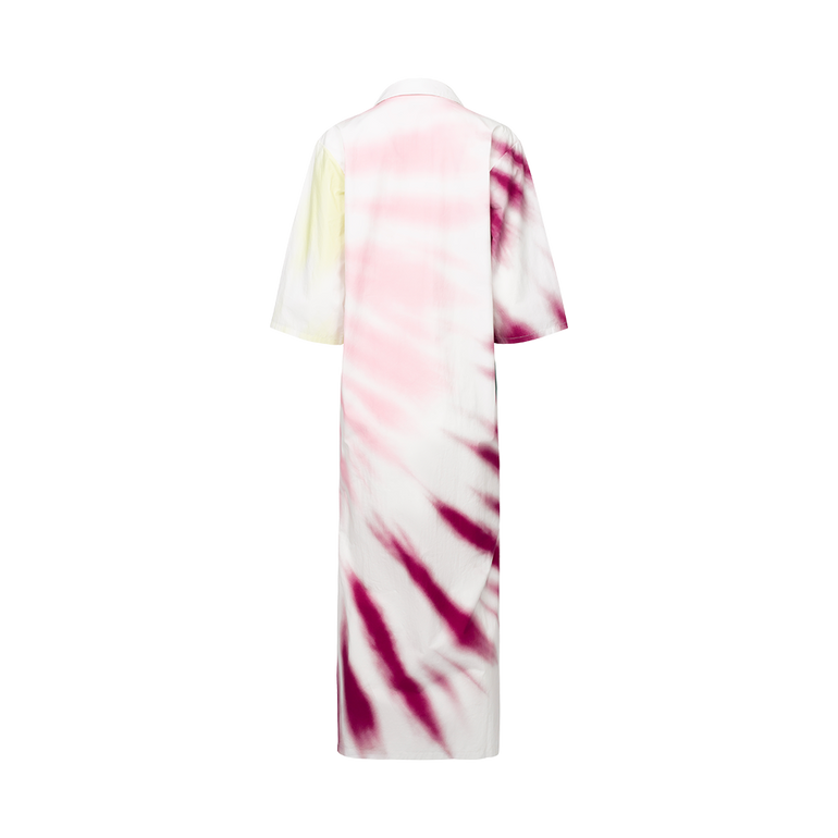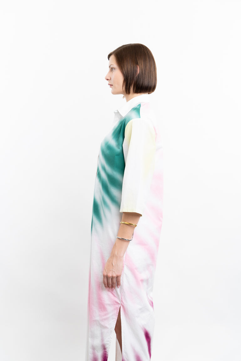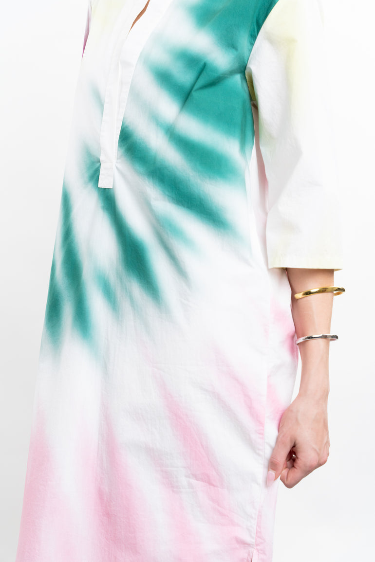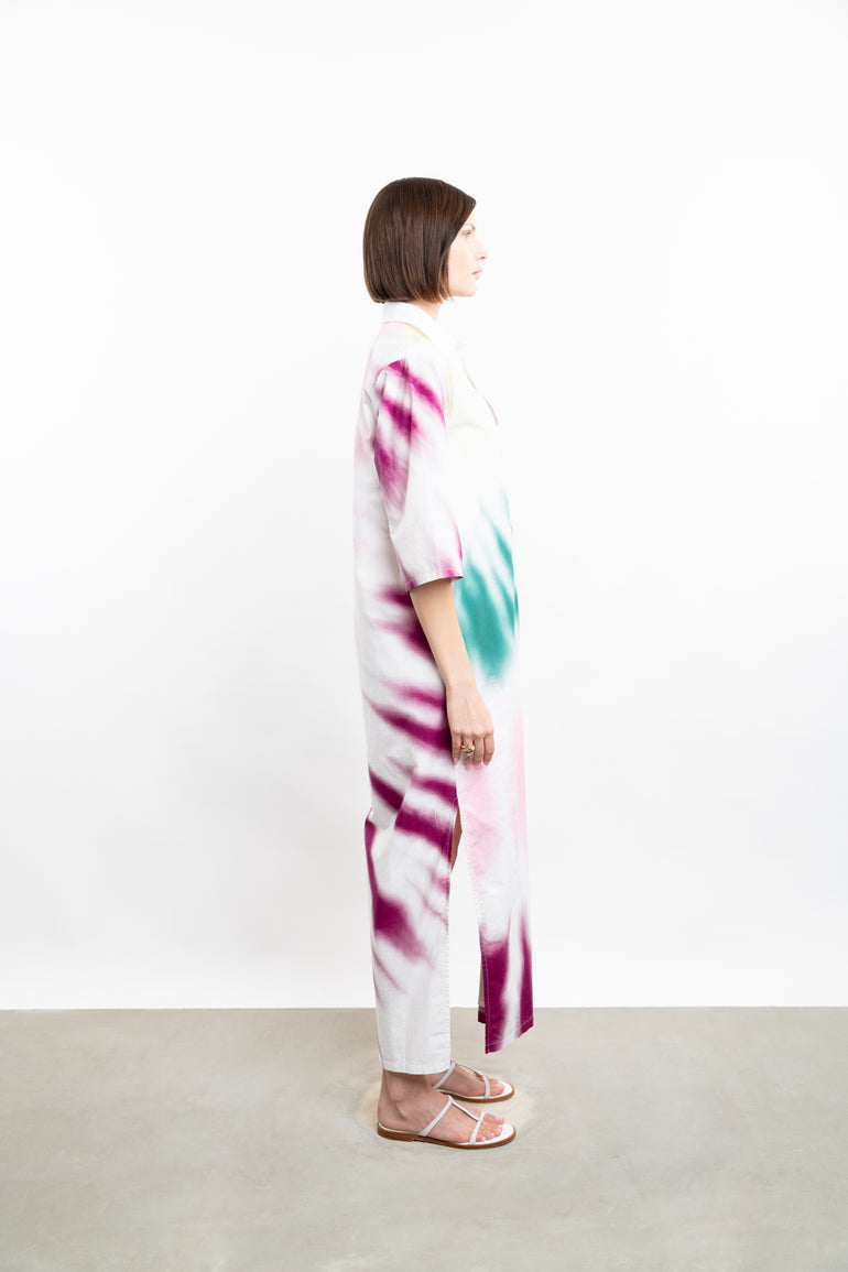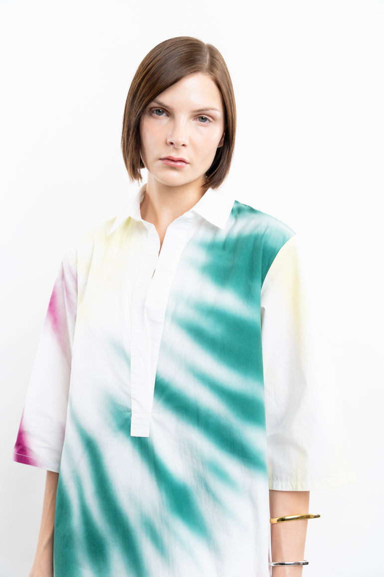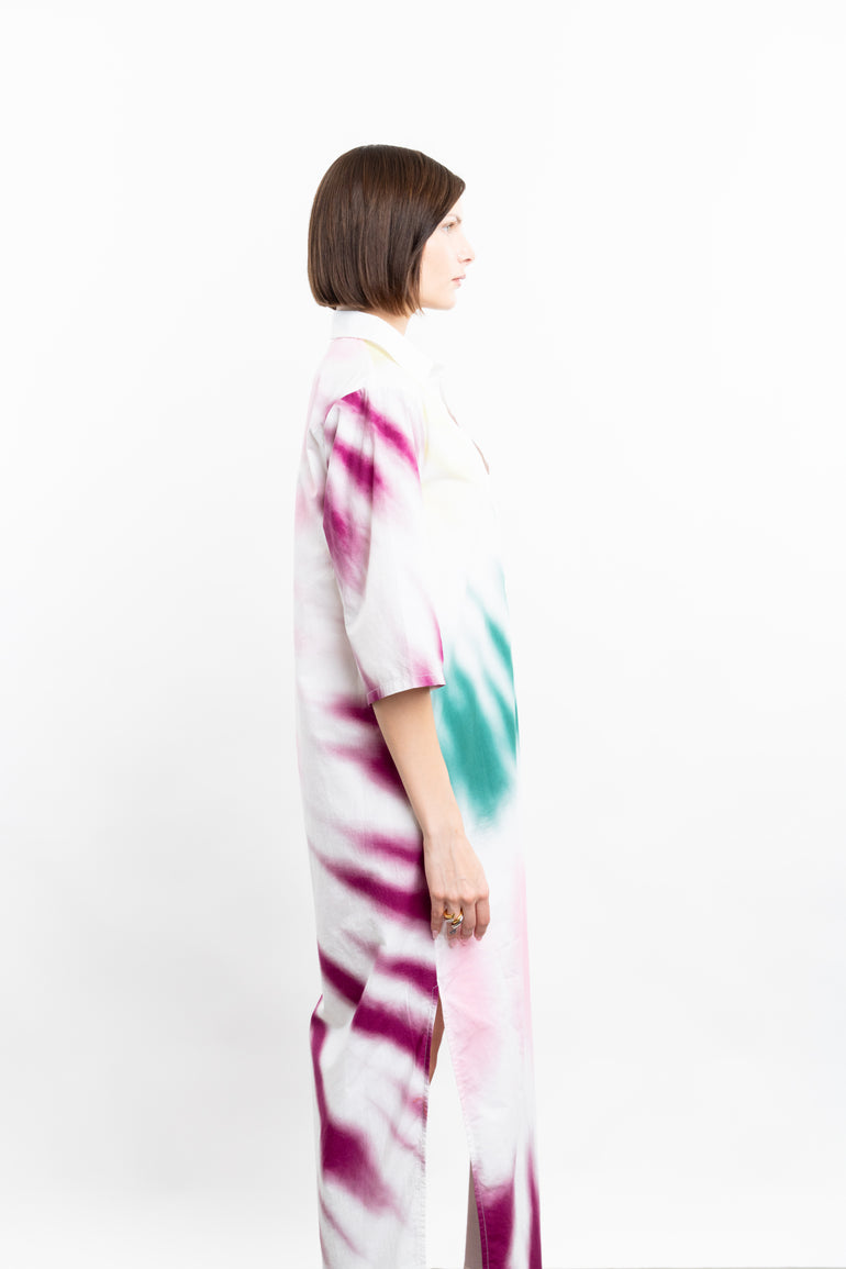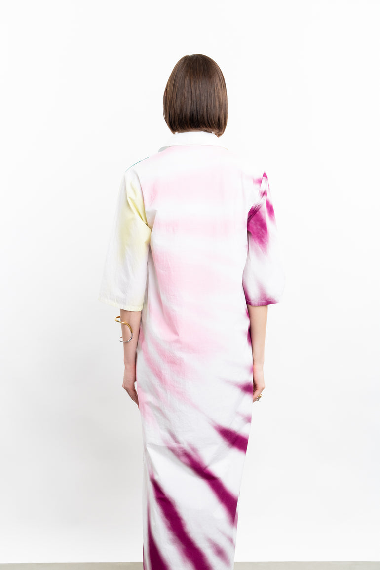Caftan dress with point collar, V-neckline, short sleeves and T-shirt silhouette.